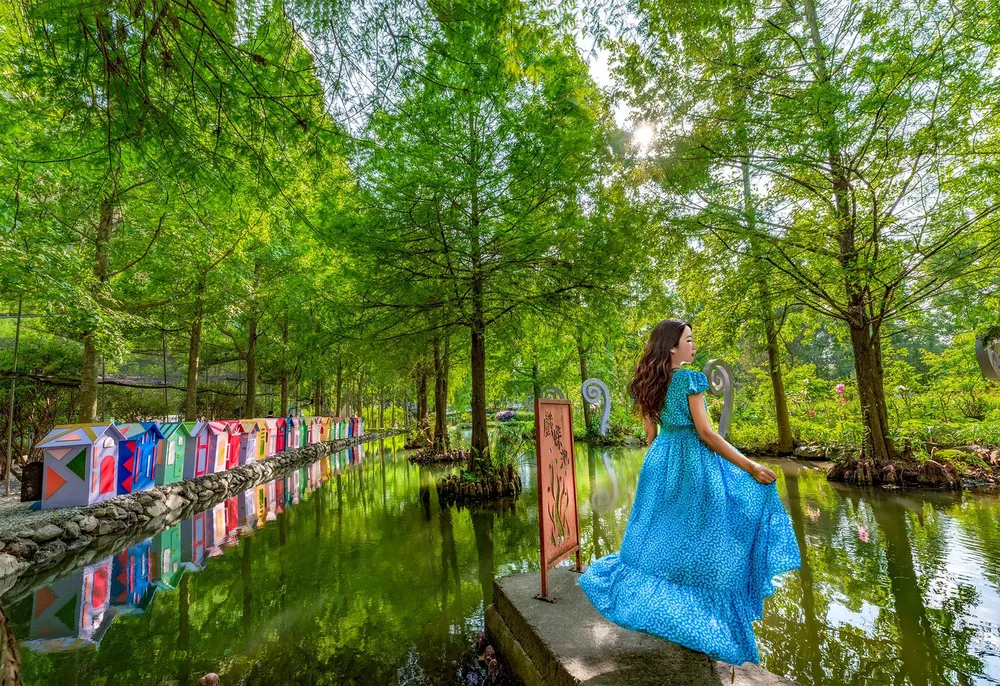 銀河水道種植多種花卉,周遭多棵落羽松所包圍,形成了虛無飄渺的美景有如人間仙境,讓踏入這裡的旅客們沉醉在花香的祕境裡。