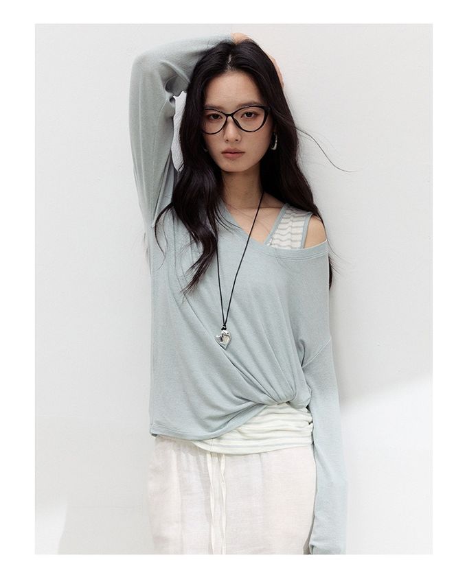 KPUWARM - 雲感天絲混亞麻U領寬鬆長袖上衣-藍條紋 (F)
