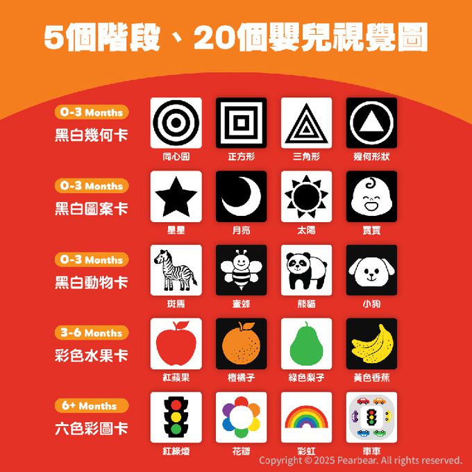 黑白與彩色結合,適應孩子不同階段視力需求