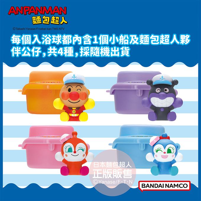 每個入浴球都內含1個小船及麵包超人夥伴公仔,共4種,採隨機出貨,會出現哪一個呢?就讓我們一起收集吧!