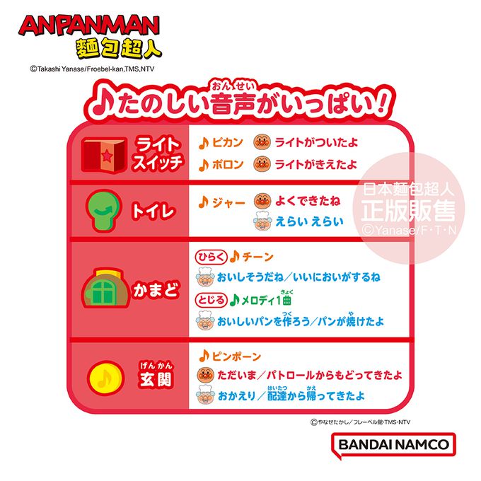 電燈開關:切換開關,電燈會亮起或關掉喔! 麵包超人:「電燈已打開嚕!」、「已關掉電燈嚕!」※若數秒無操作動作時,電燈會自動關掉。