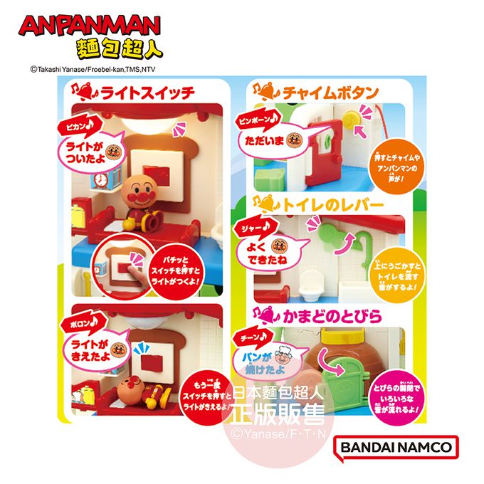 抽屜:可放置麵包喔!;床:可讓人偶睡在床上呢!;門鈴:按下門鈴,就會發出麵包超人的日文對話喔!「叮咚!我回來了~」