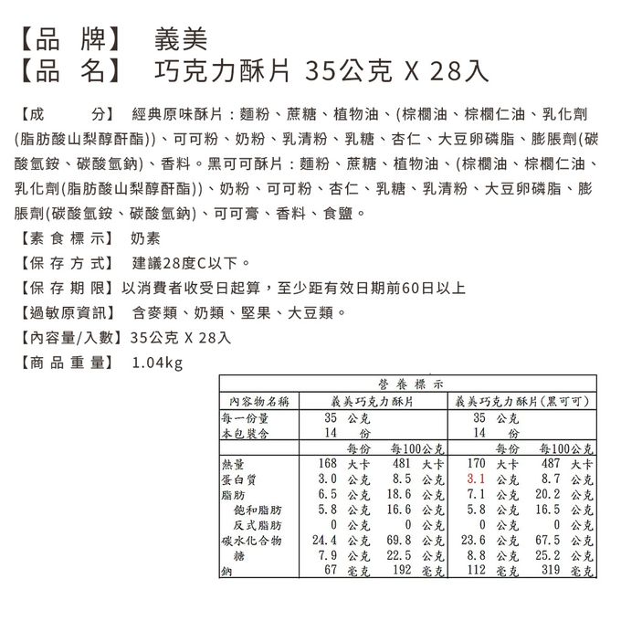 品名:義美 巧克力酥片雙口味組合(35公克 X 28入)