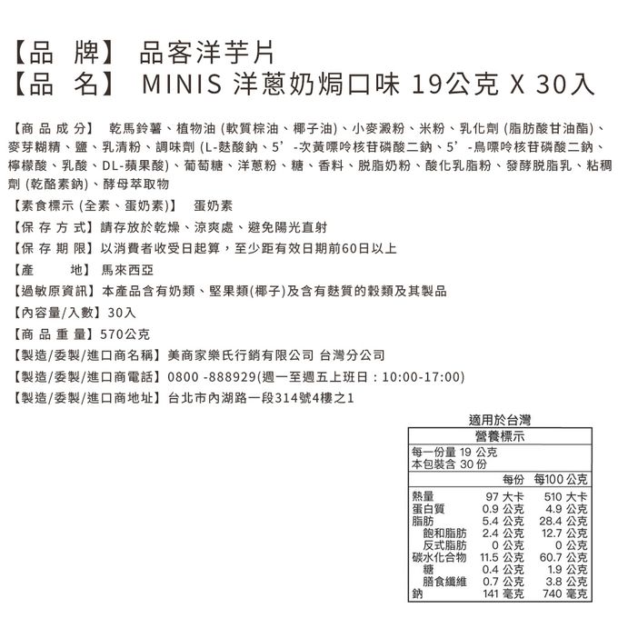 品名:品客洋芋片 MINIS 洋蔥奶焗口味19公克 X 30入
