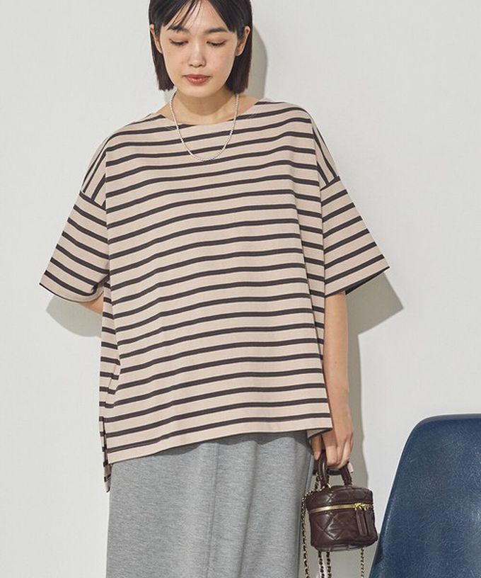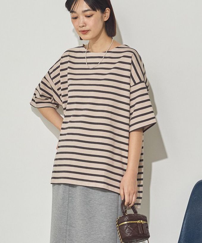 日本 Sans Souci 34+ - 100%棉 定番條紋落肩五分袖上衣-卡其x深灰