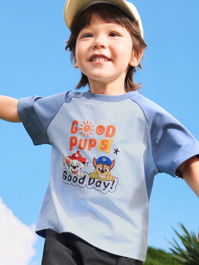 卡通汪汪隊拼袖撞色短袖上衣-灰藍