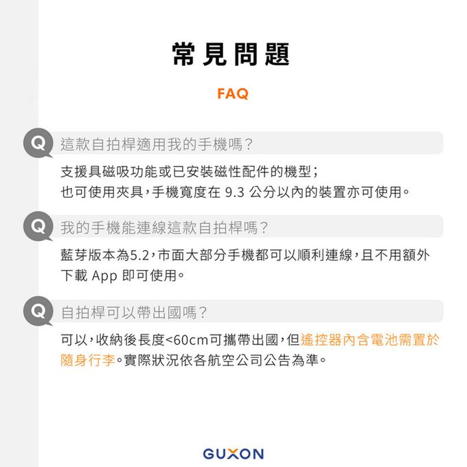內容物:自拍架*1、手機夾*1、USB-A to USB-C充電線*1(約30cm)、短掛繩*1、登山扣*1、磁吸貼片*1、說明書*1