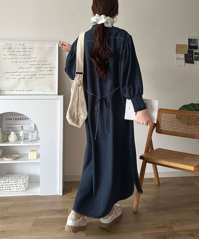 • 品名:速乾抗皺 俐落領綁腰泡泡袖洋裝