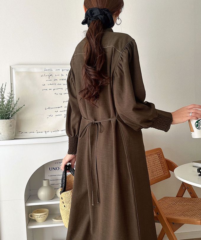 日本 Classical Elf - 2way前後穿綁帶修身澎澎長袖洋裝-卡其米