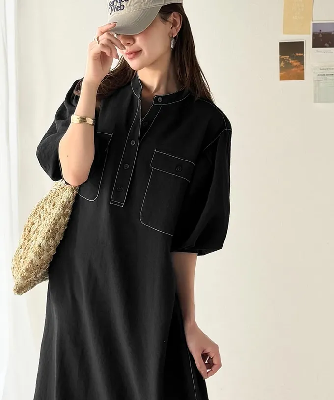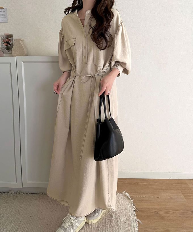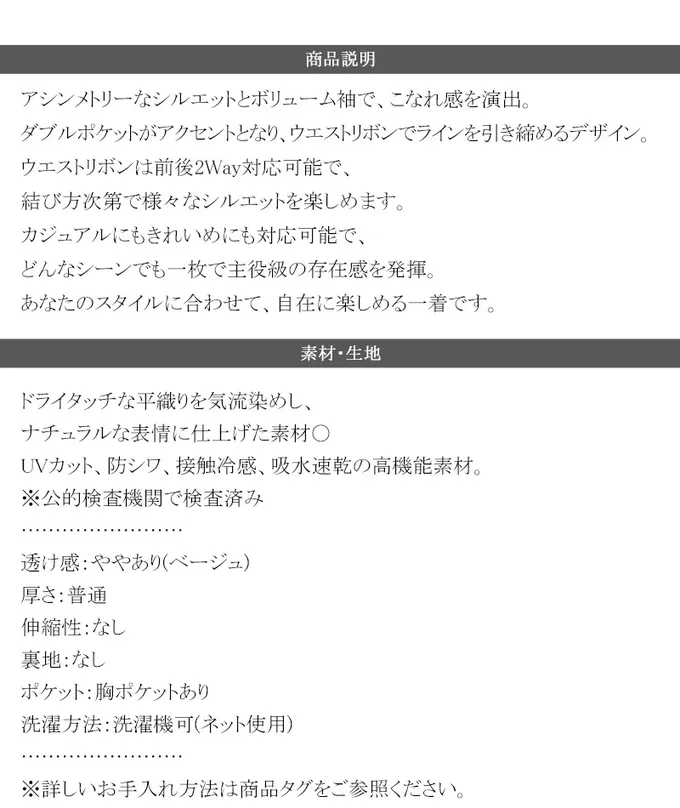 • 品名:速乾抗皺 俐落領綁腰泡泡袖洋裝