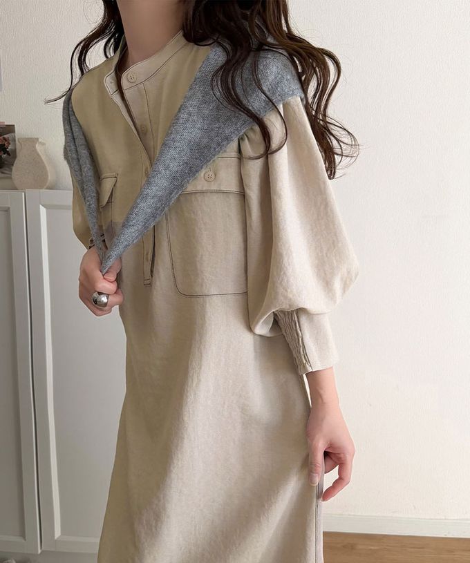 日本 Classical Elf - 2way前後穿綁帶修身澎澎長袖洋裝-卡其米