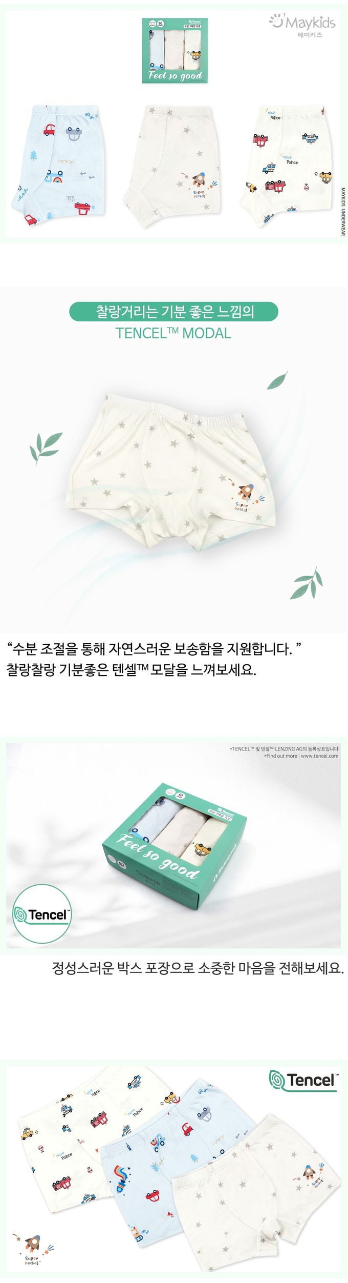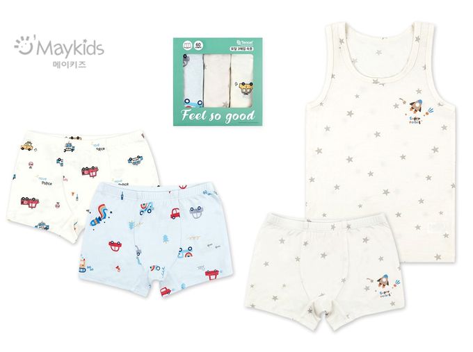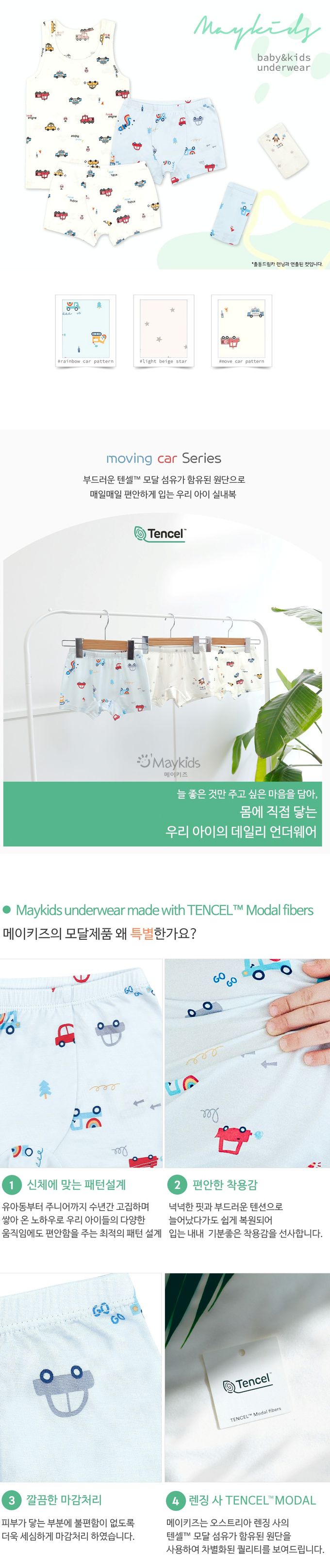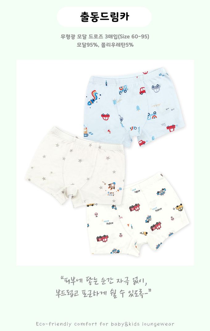 韓國 Maykids - (3入組)男寶天絲莫代爾透氣四角褲-繽紛車車X星星火箭-米白X淺藍