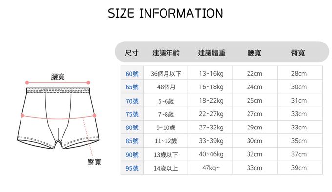 60[適穿年齡~3Y;體重13~16kg]、65[適穿年齡3~4Y;體重16~18kg]、70[適穿年齡5~6Y;體重18~22kg]、75[適穿年齡7~8Y;體重22~27kg]、80[適穿年齡9~10Y;體重27~32kg]、85[適穿年齡11~12Y;體重33~39kg]、90[適穿年齡13~14Y;體重40~46kg]、95[適穿年齡14Y~;體重47~kg]