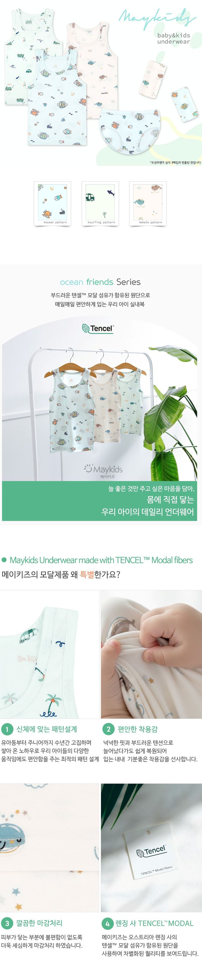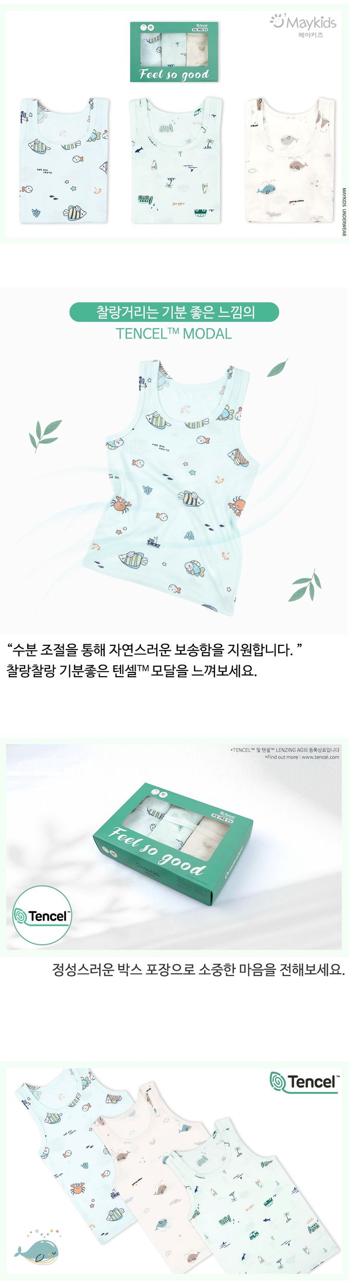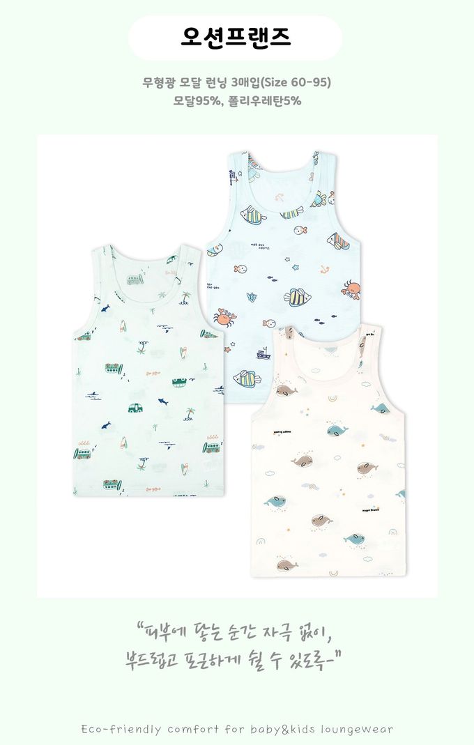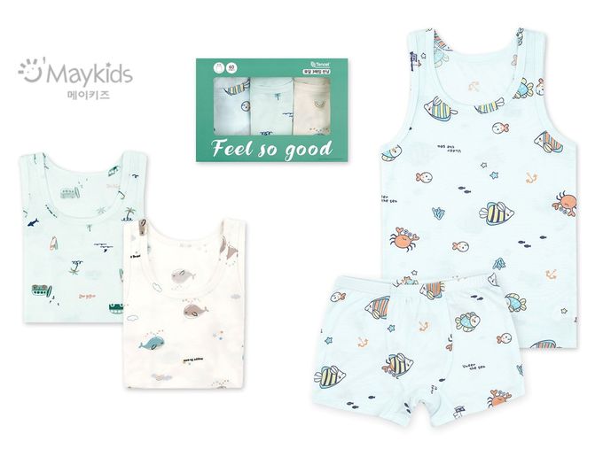 韓國 Maykids - (3入組)男寶天絲莫代爾透氣背心-海底動物們-米膚X淺綠X淺藍