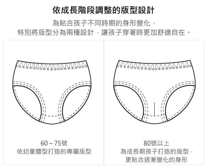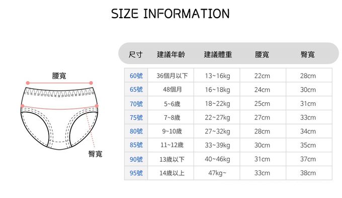 60[適穿年齡~3Y;體重13~16kg]、65[適穿年齡3~4Y;體重16~18kg]、70[適穿年齡5~6Y;體重18~22kg]、75[適穿年齡7~8Y;體重22~27kg]、80[適穿年齡9~10Y;體重27~32kg]、85[適穿年齡11~12Y;體重33~39kg]、90[適穿年齡13~14Y;體重40~46kg]、95[適穿年齡14Y~;體重47~kg]