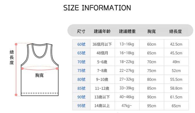60[適穿年齡~3Y;體重13~16kg]、65[適穿年齡3~4Y;體重16~18kg]、70[適穿年齡5~6Y;體重18~22kg]、75[適穿年齡7~8Y;體重22~27kg]、80[適穿年齡9~10Y;體重27~32kg]、85[適穿年齡11~12Y;體重33~39kg]、90[適穿年齡13~14Y;體重40~46kg]、95[適穿年齡14Y~;體重47~kg]