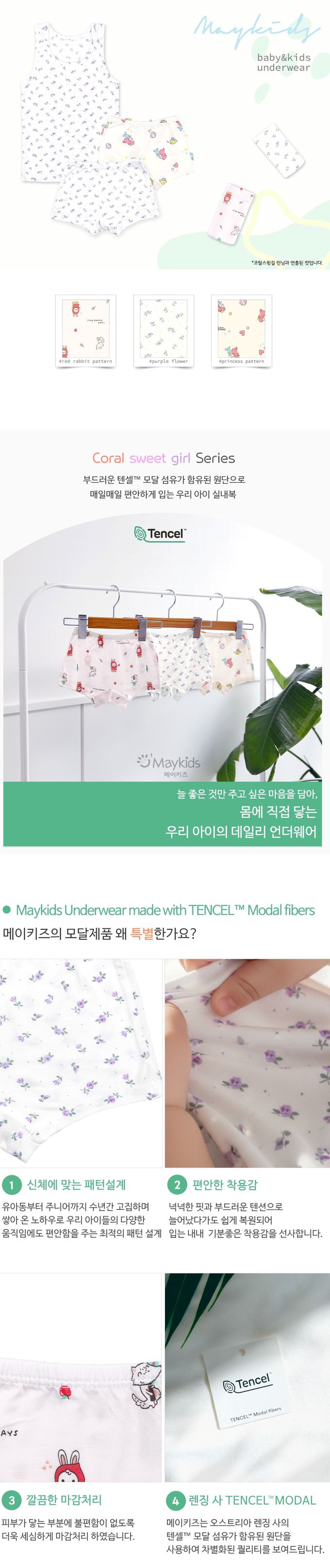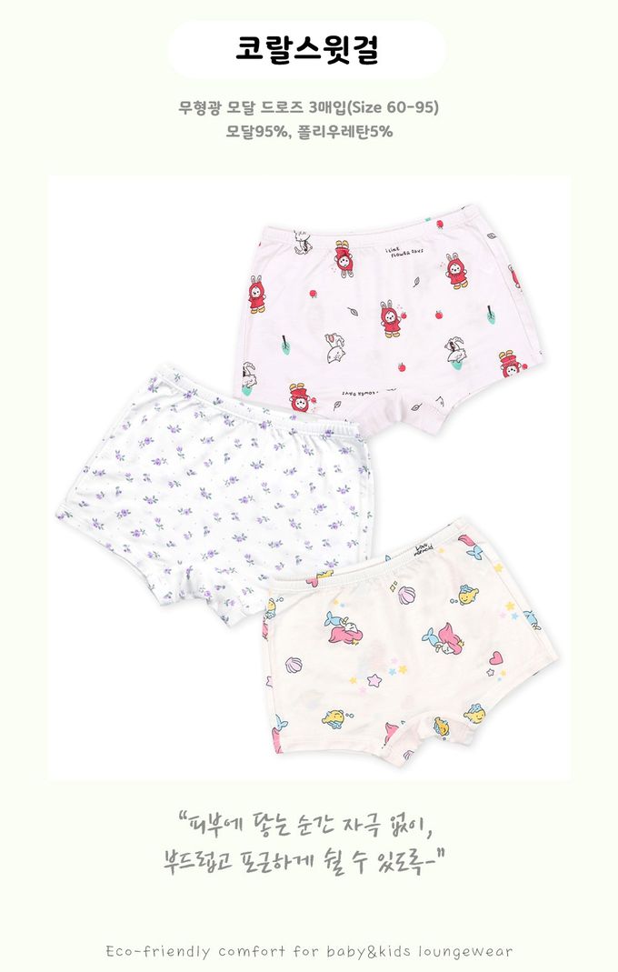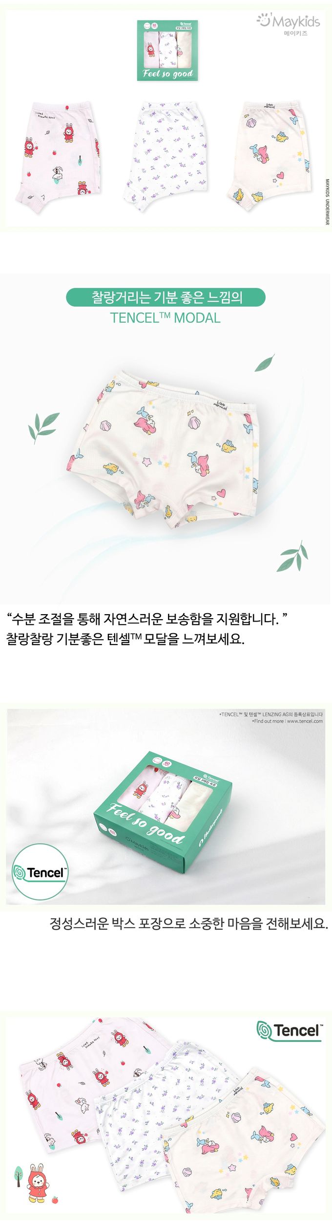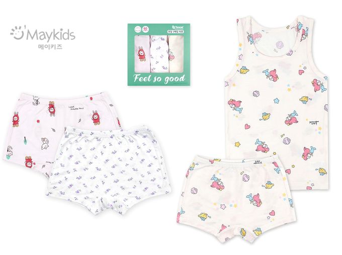 韓國 Maykids - (3入組)女寶天絲莫代爾透氣四角褲-海洋公主X紅帽兔兔-米白X米X淺粉