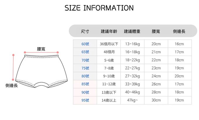 60[適穿年齡~3Y;體重13~16kg]、65[適穿年齡3~4Y;體重16~18kg]、70[適穿年齡5~6Y;體重18~22kg]、75[適穿年齡7~8Y;體重22~27kg]、80[適穿年齡9~10Y;體重27~32kg]、85[適穿年齡11~12Y;體重33~39kg]、90[適穿年齡13~14Y;體重40~46kg]、95[適穿年齡14Y~;體重47~kg]