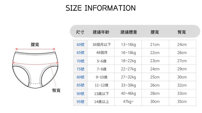 60[適穿年齡~3Y;體重13~16kg]、65[適穿年齡3~4Y;體重16~18kg]、70[適穿年齡5~6Y;體重18~22kg]、75[適穿年齡7~8Y;體重22~27kg]、80[適穿年齡9~10Y;體重27~32kg]、85[適穿年齡11~12Y;體重33~39kg]、90[適穿年齡13~14Y;體重40~46kg]、95[適穿年齡14Y~;體重47~kg]