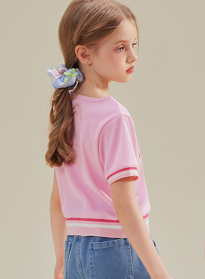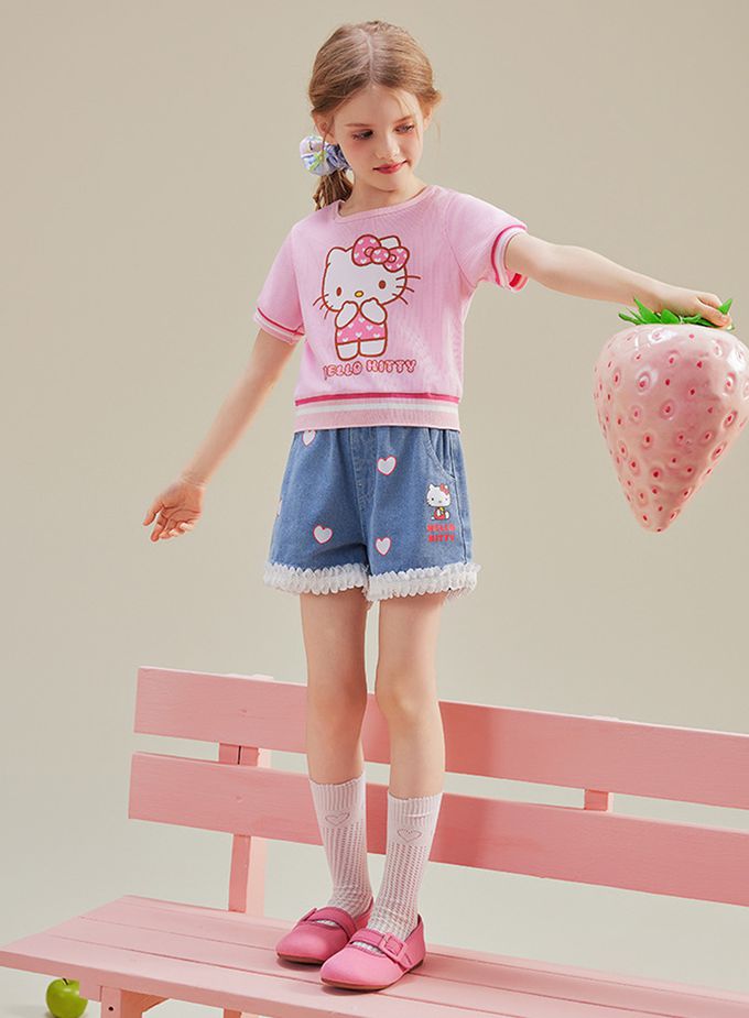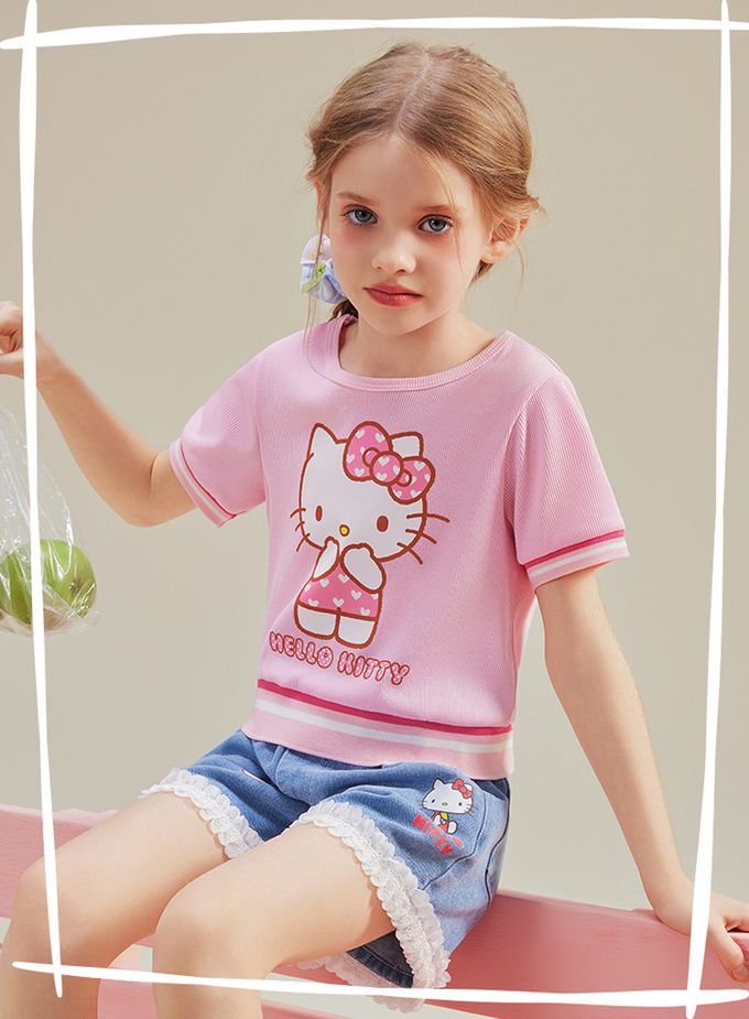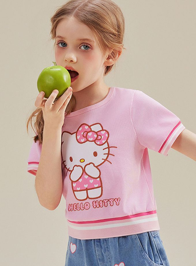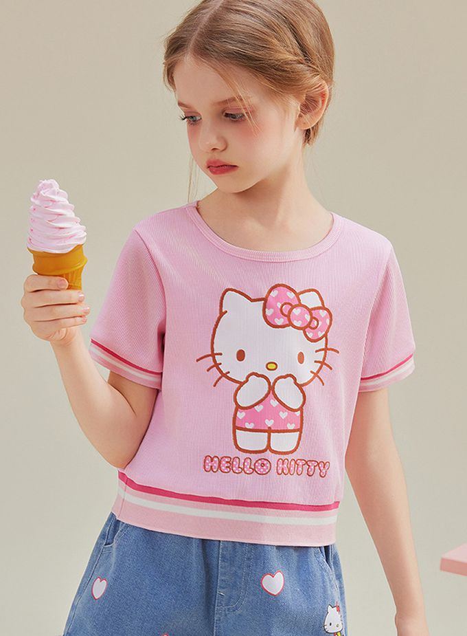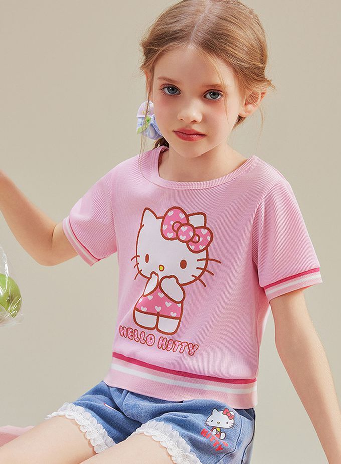 人氣卡通 - 撞色中短版短袖上衣-卡通人物Hello Kitty-粉色