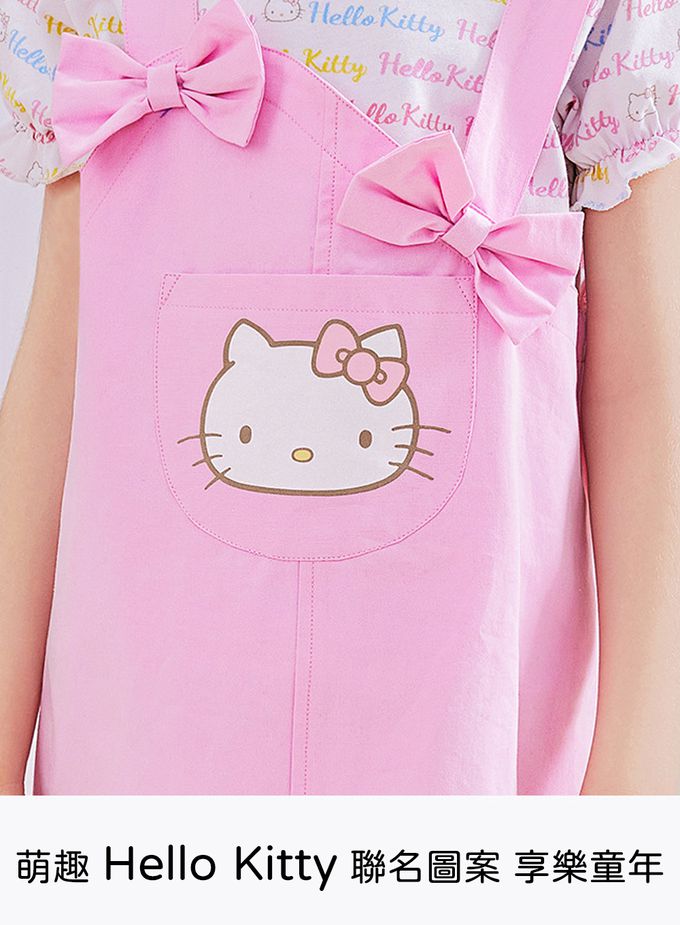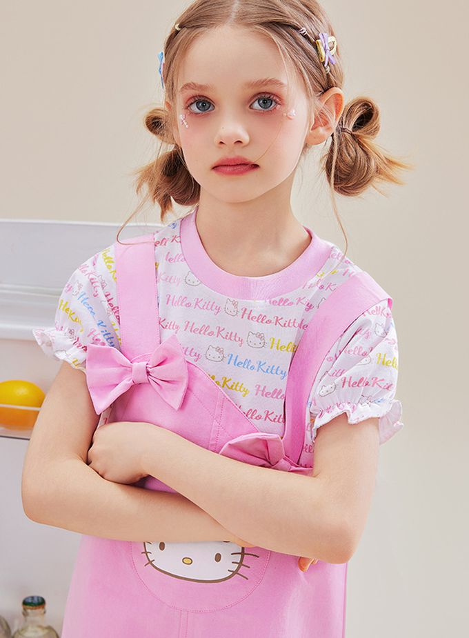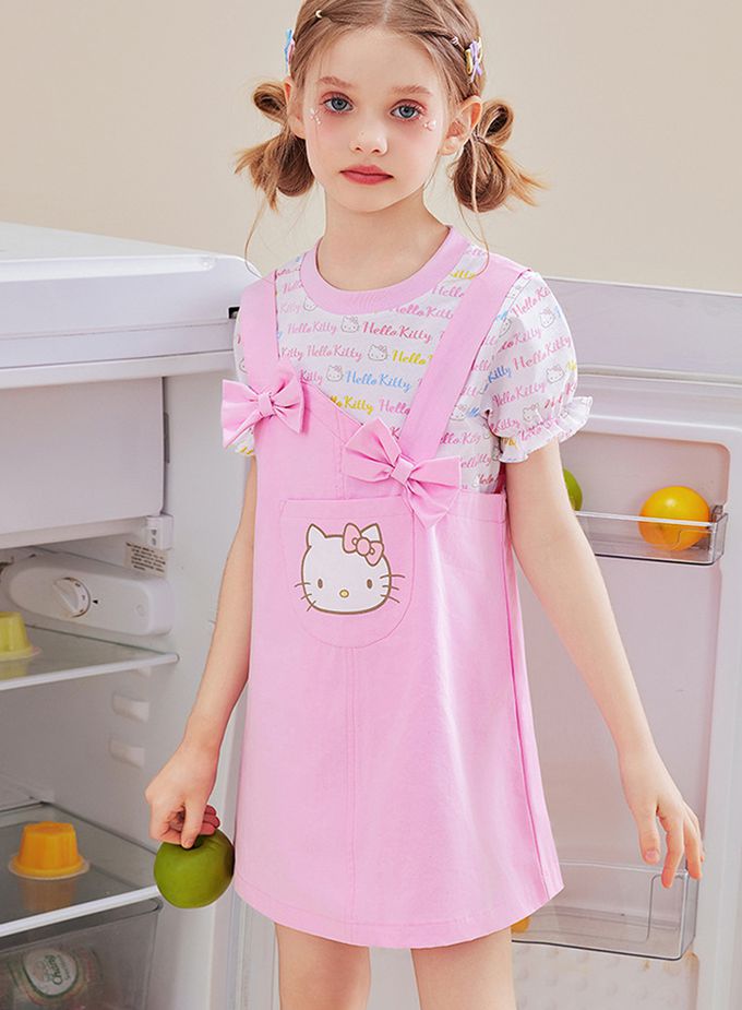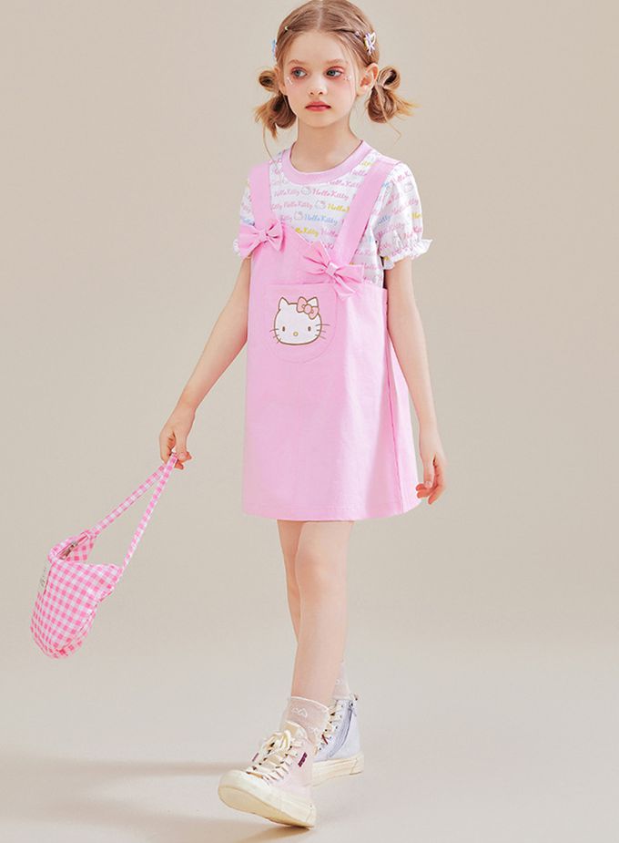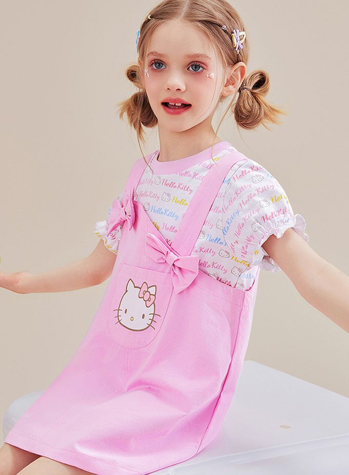 人氣卡通 - 純棉假兩件吊帶短袖洋裝-卡通人物Hello Kitty-粉色