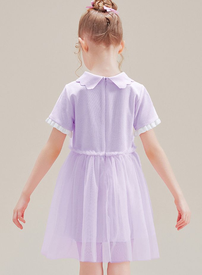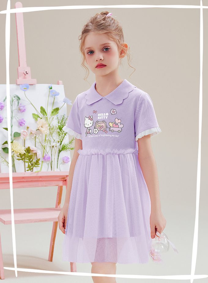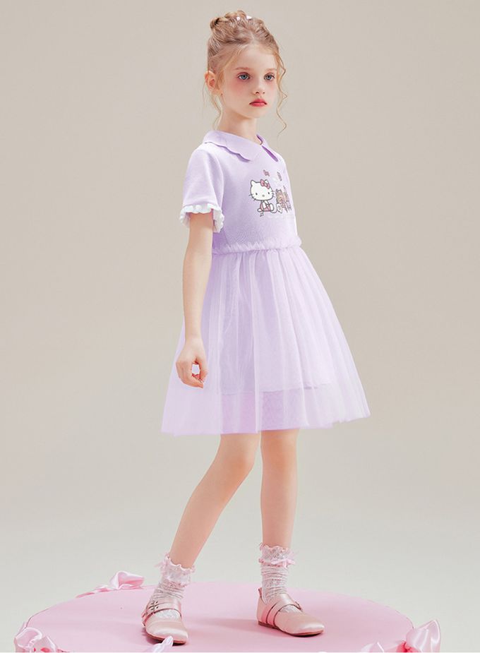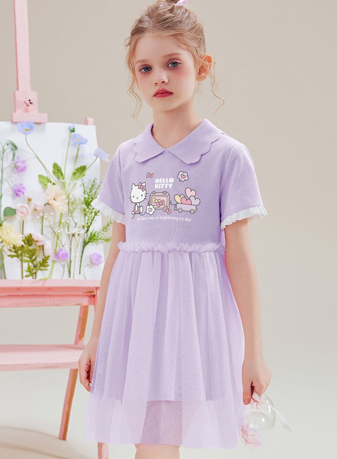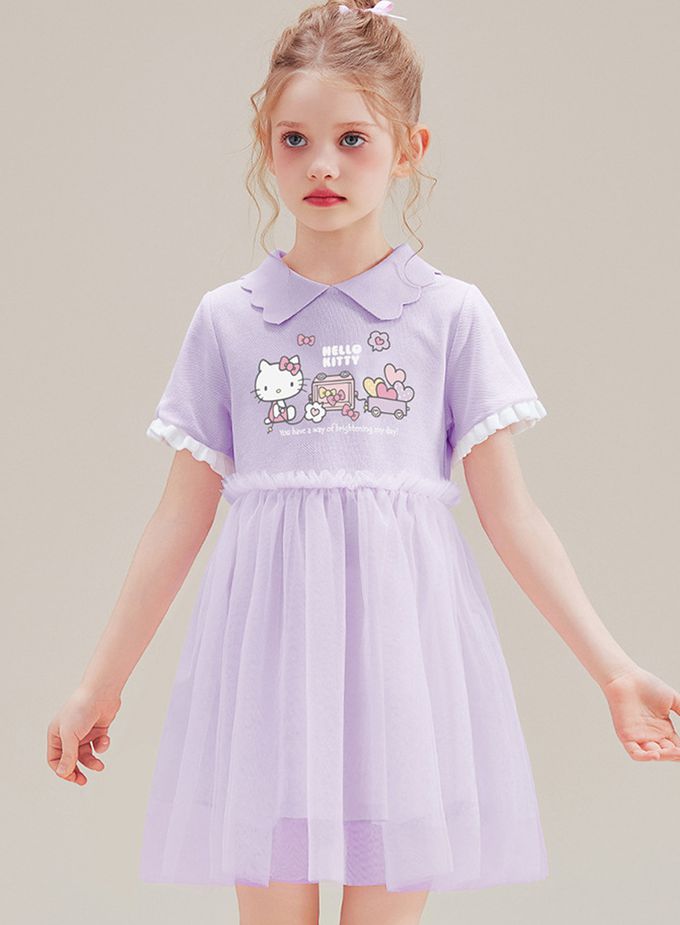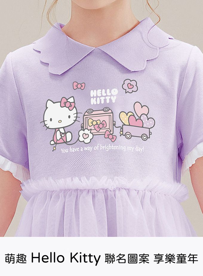 花邊翻領網紗拼接短袖洋裝-卡通人物Hello Kitty-紫色