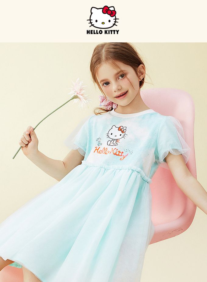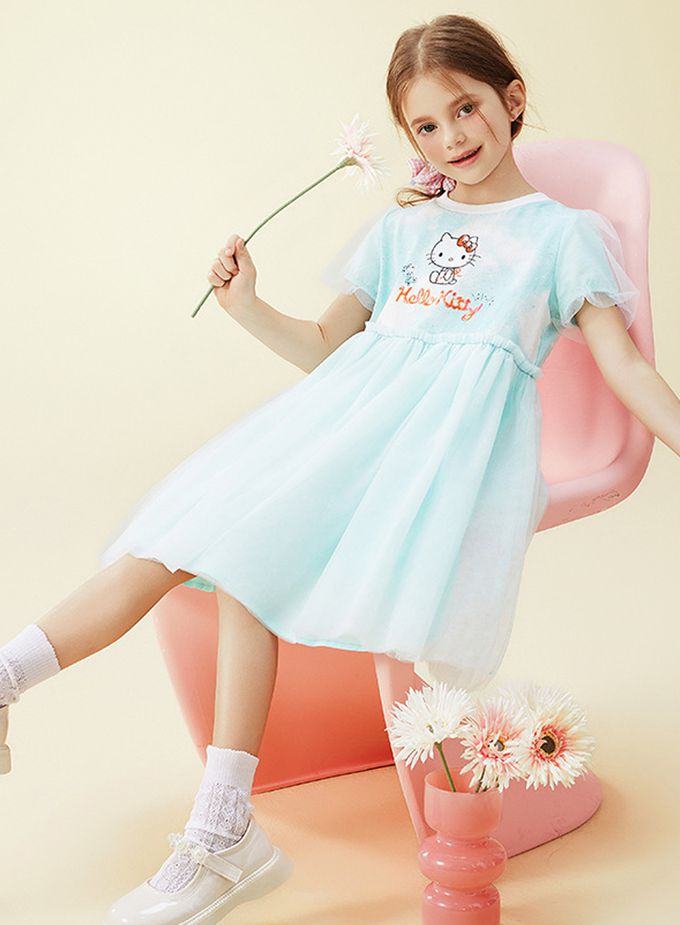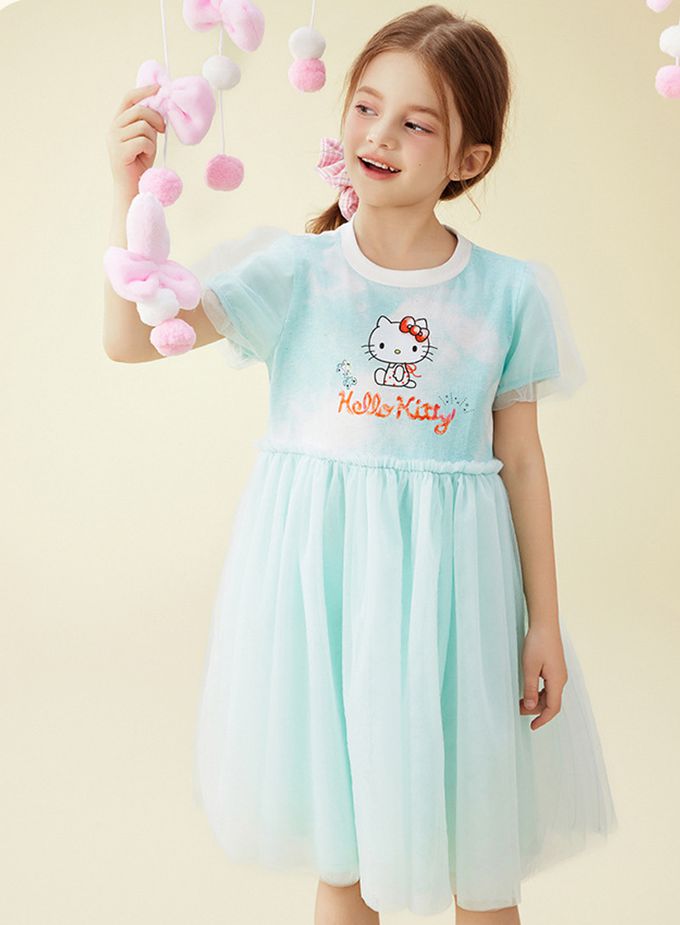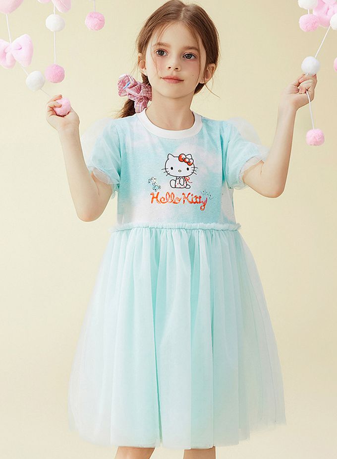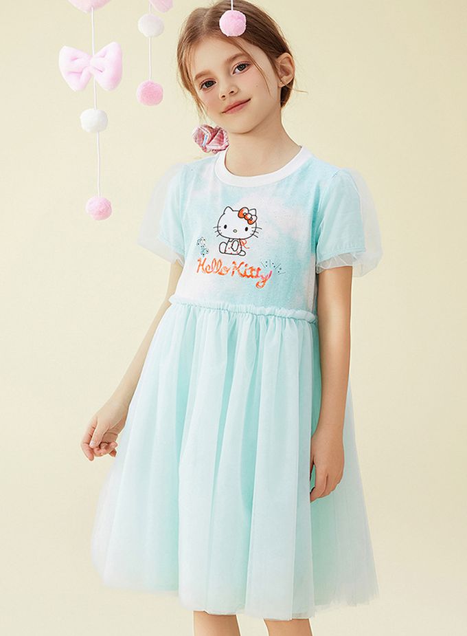 人氣卡通 - 浪漫網紗泡泡短袖洋裝-卡通人物Hello Kitty-藍綠