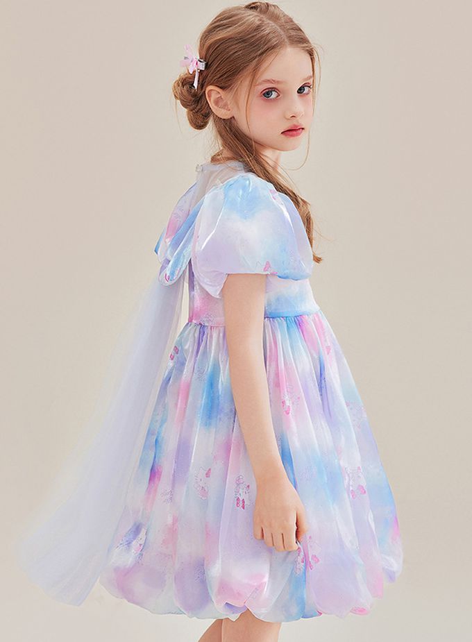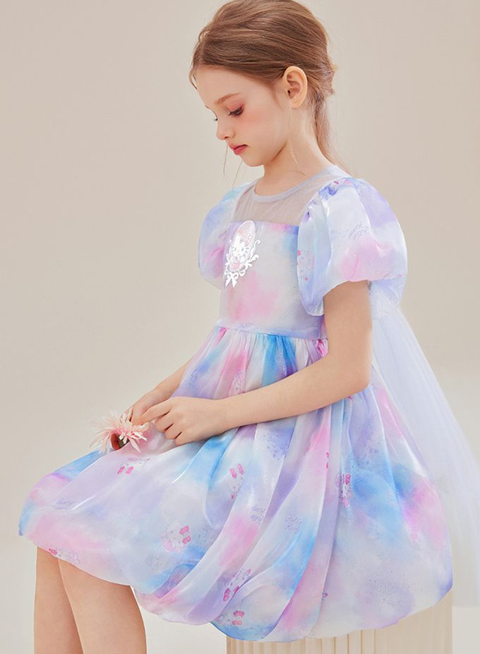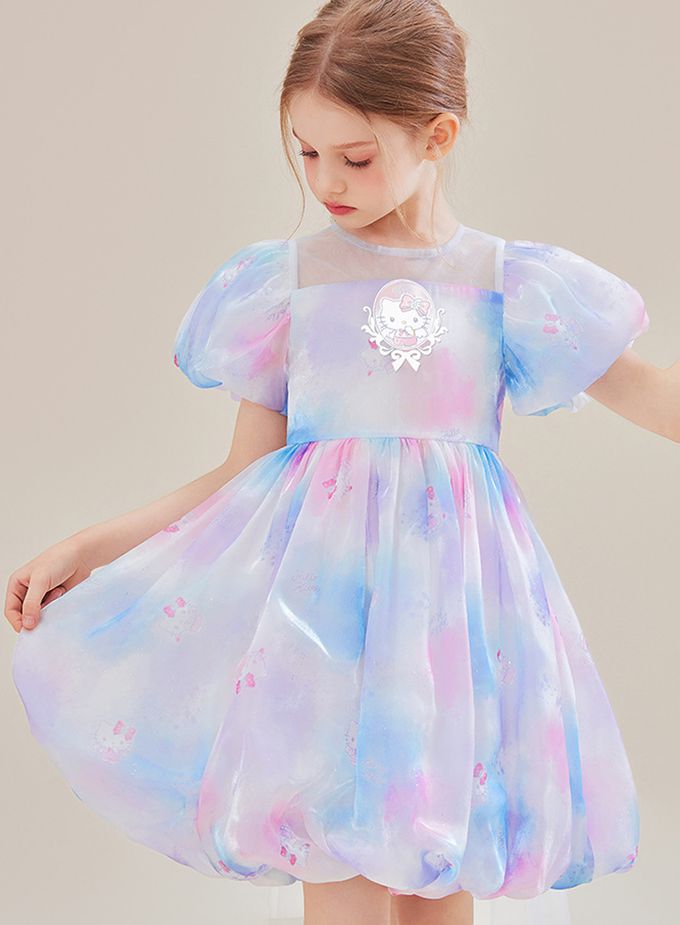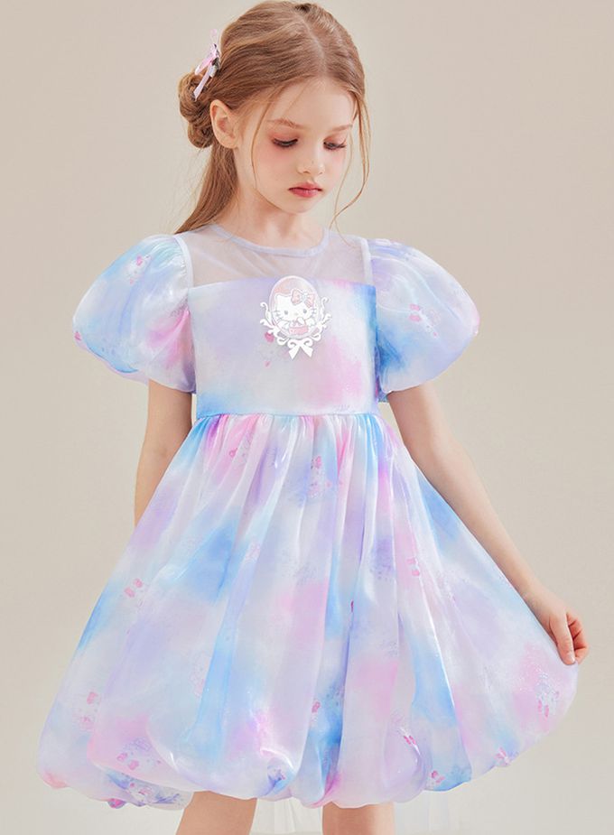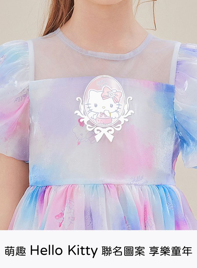 夢幻暈染後蝴蝶結泡泡短袖洋裝-卡通人物Hello Kitty-粉x紫x藍