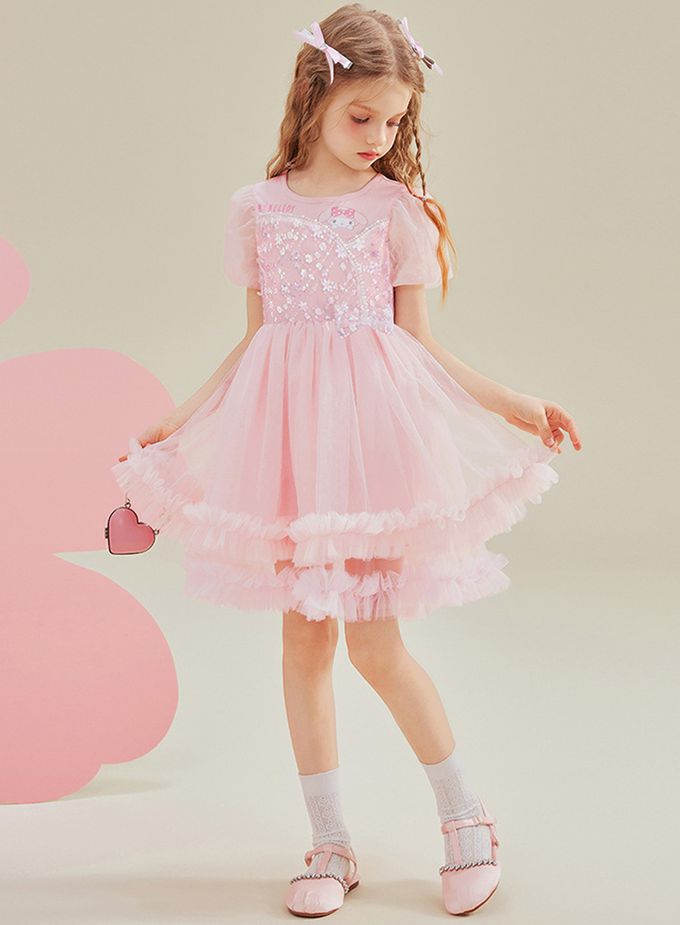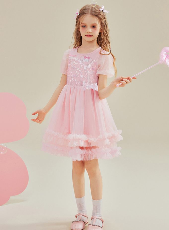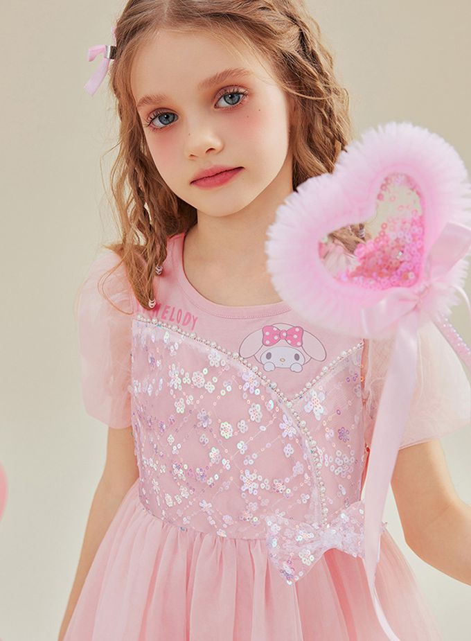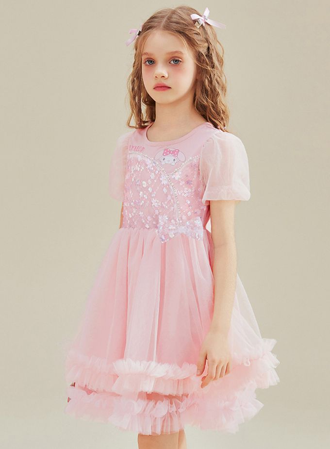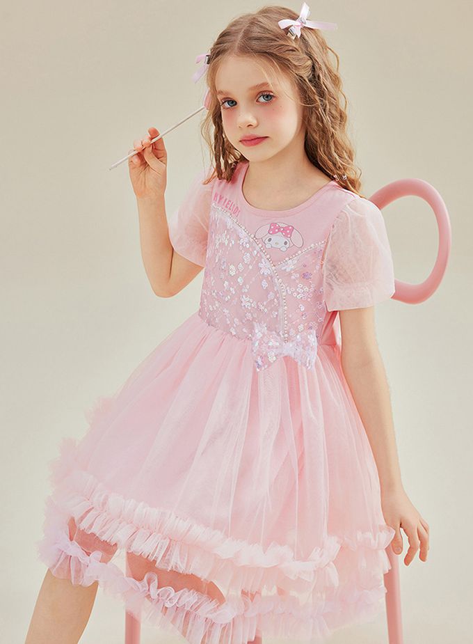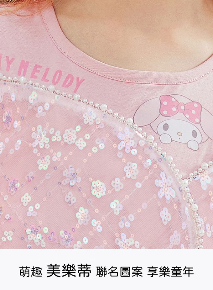 夢幻亮片珍珠滾邊網紗短袖洋裝-卡通人物美樂蒂-粉色