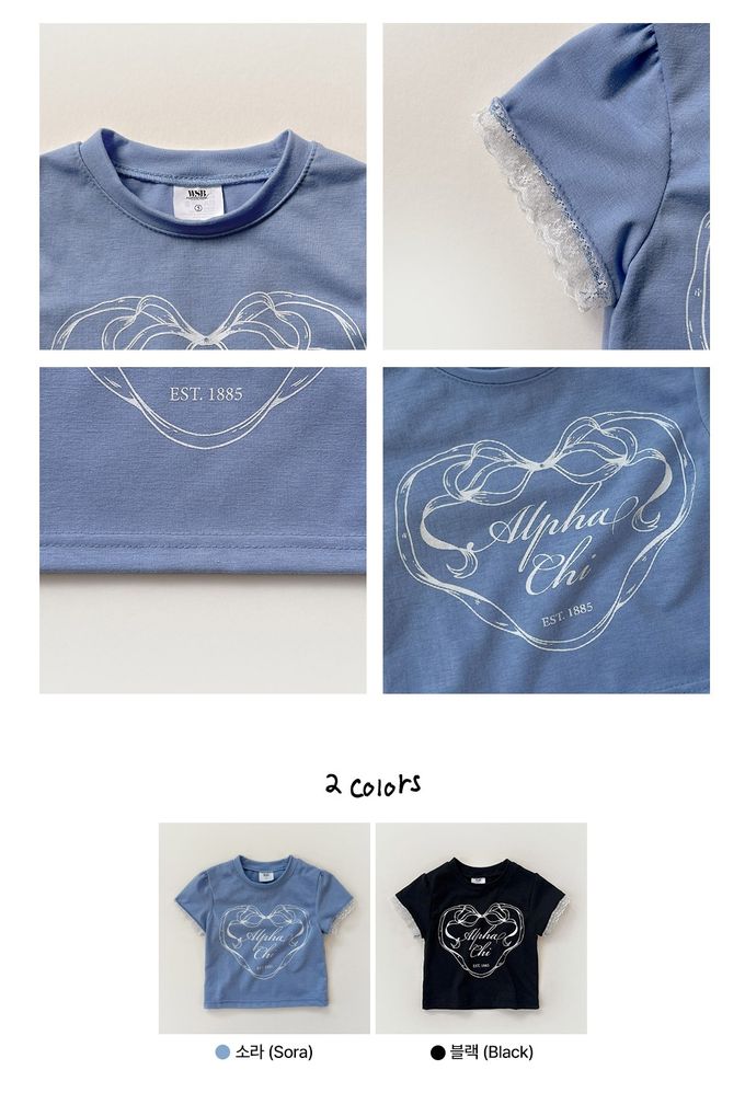 韓國南大門童裝 - W.S.B. 造型蕾絲點綴短袖上衣-蝴蝶結緞帶愛心印-灰藍