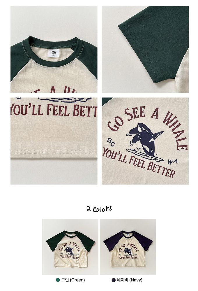 韓國南大門童裝 - W.S.B. 純棉拼色短袖上衣-鯨魚飛躍圖案-米X海軍藍