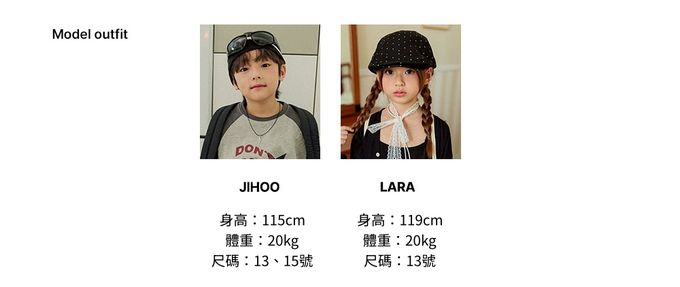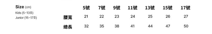 1. 尺寸表單位皆為公分(cm),實際尺寸會因布料彈性、水洗、測量起迄點等因素略有誤差。建議參考孩子平時穿著衣物尺寸進行選購。
