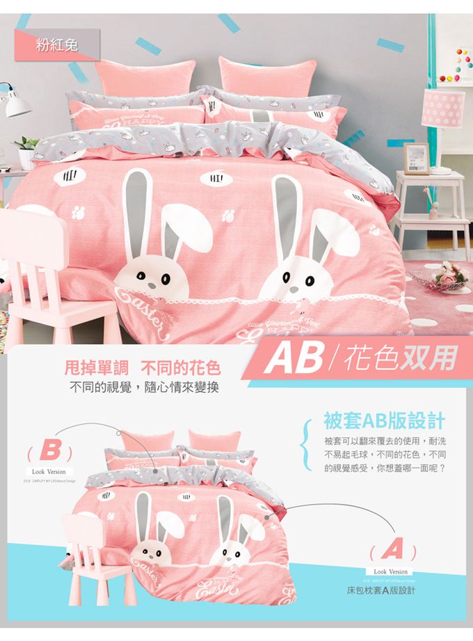 台灣製 極致純棉寢具組-粉紅兔-加大四件式床包被套組
