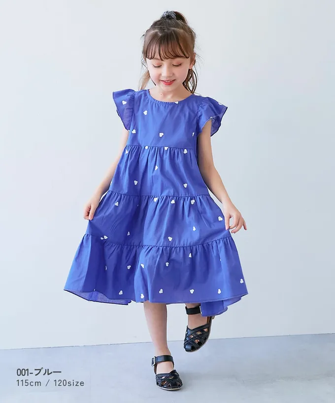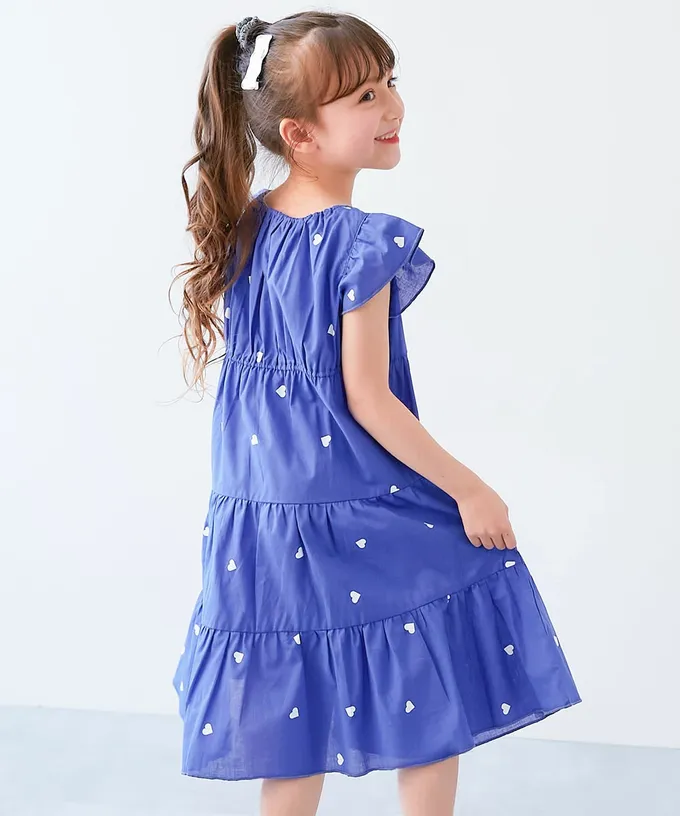 日本 devirock - 100%棉 輕盈荷葉分層短袖洋裝-刺繡愛心-寶藍