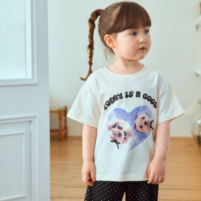 韓國南大門童裝 - First Blue 愛心墨鏡狗狗純棉短袖上衣-米黃