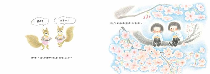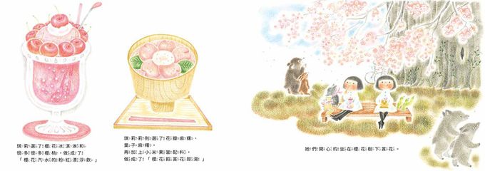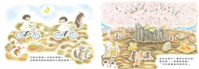 騎著騎著,她們發現了一棵好大好的櫻花樹,許多小動物正在櫻花樹下野餐;