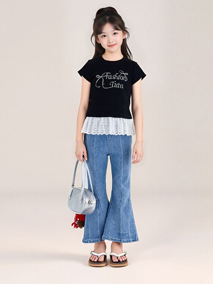 甜美貼鑽蕾絲拼接短袖上衣-黑色