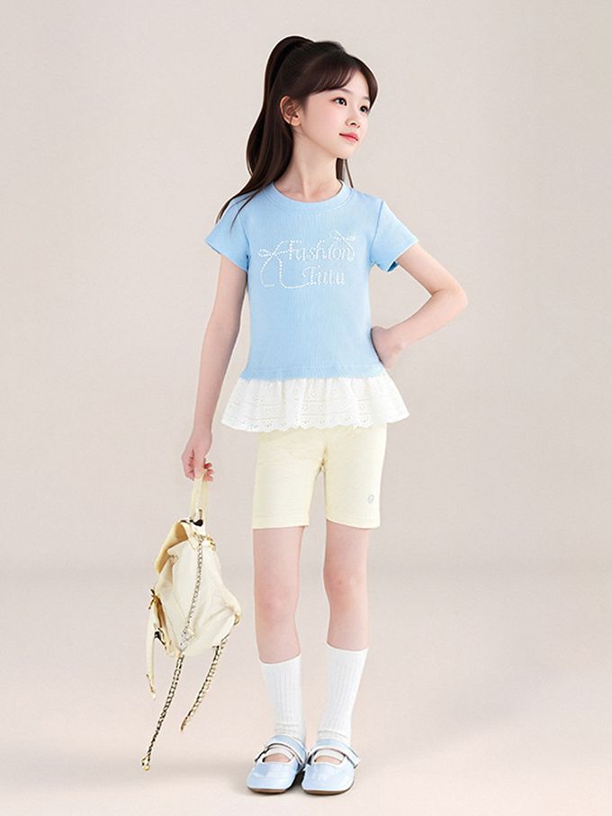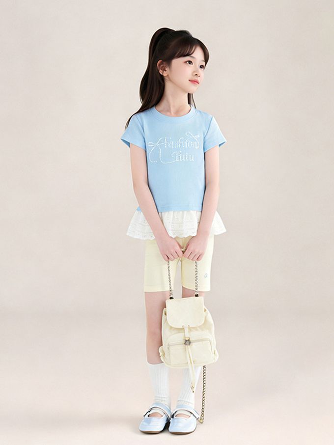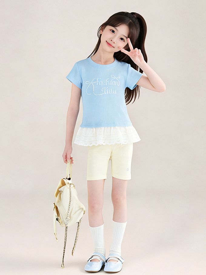 甜美貼鑽蕾絲拼接短袖上衣-藍色