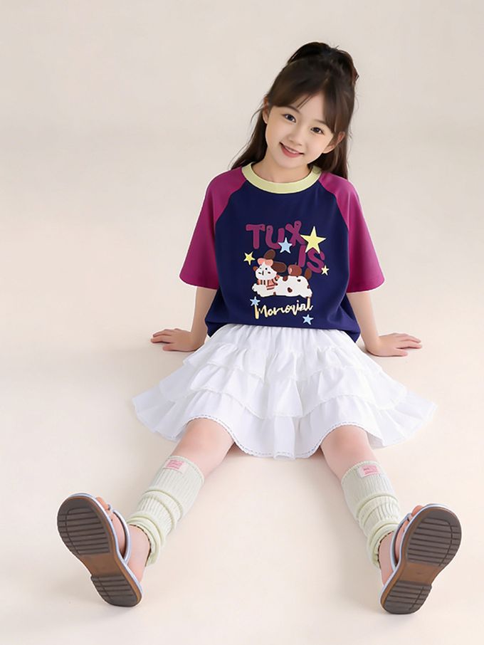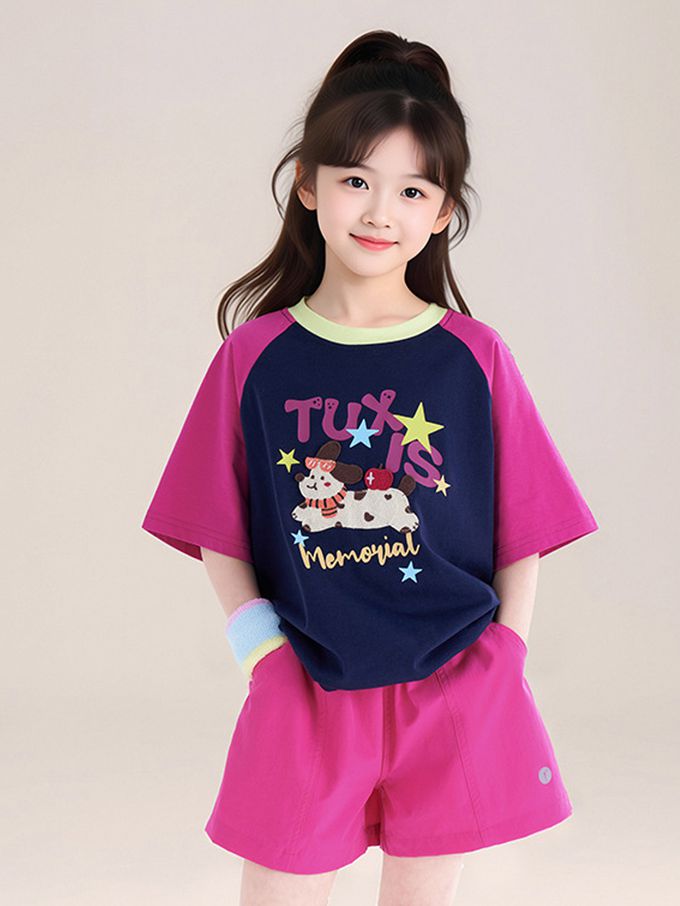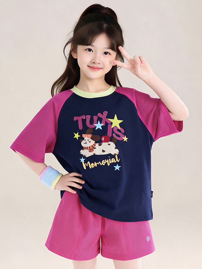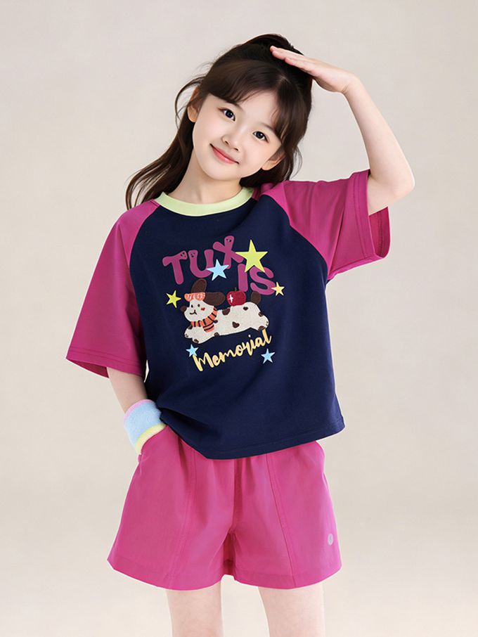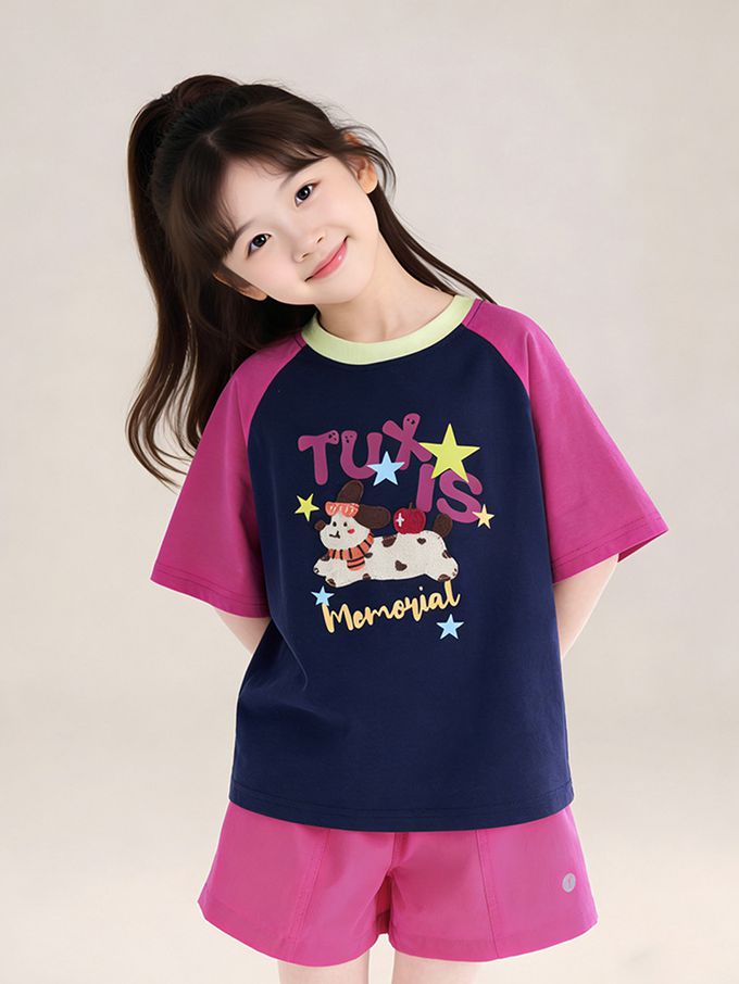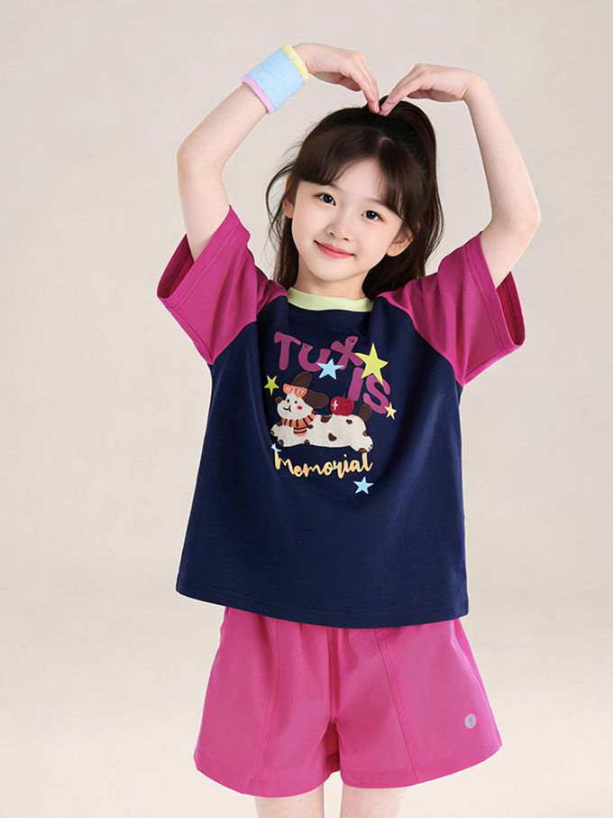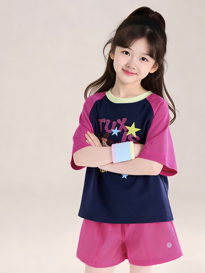 涼感撞色印花短袖上衣/T恤-藏青x紫紅