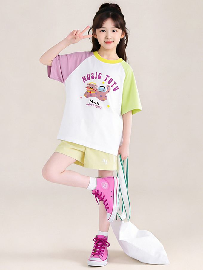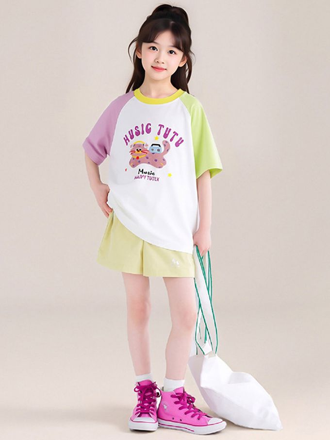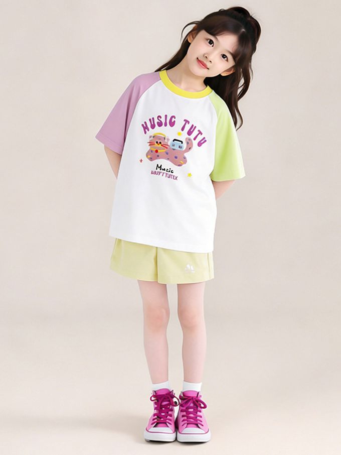 涼感撞色印花短袖上衣/T恤-白x紫x黃