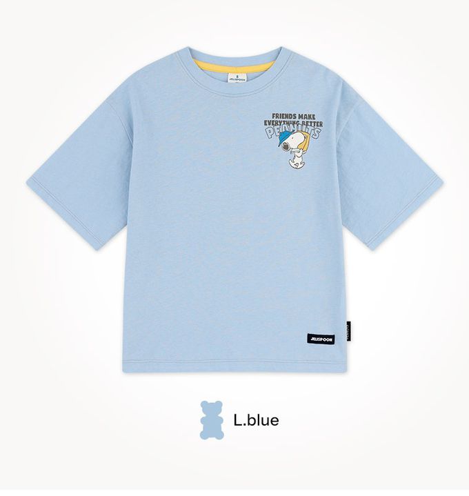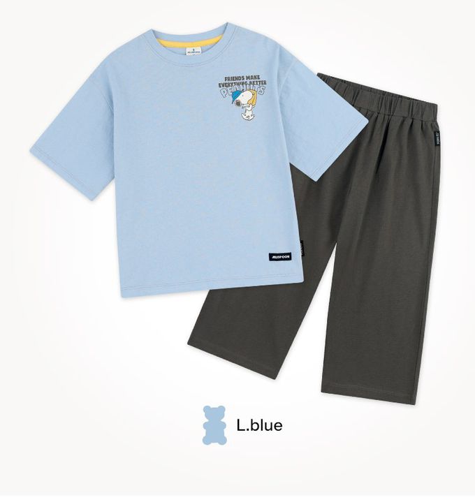 韓國 Jelispoon - (聯名款)卡通人物史努比短袖上衣X長褲套裝-淺藍X深灰