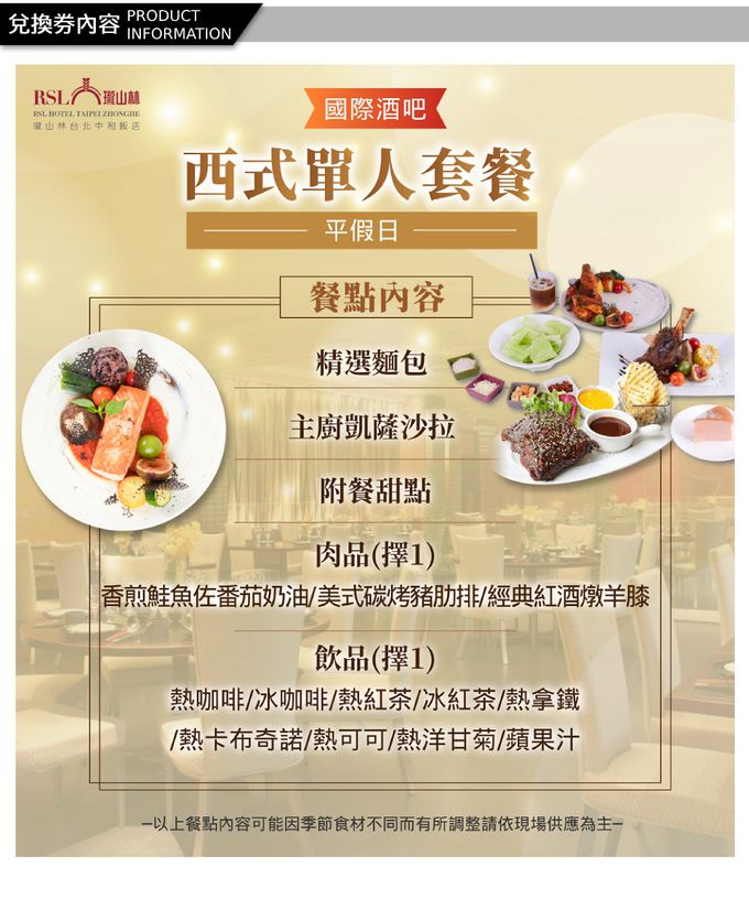 1.單張可單人於《瓏山林中和飯店1樓國際酒吧》享用西式單人午間套餐。(已含服務費)