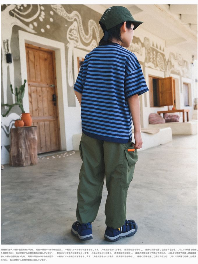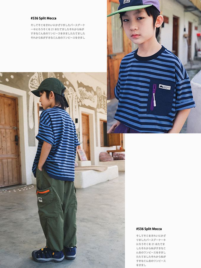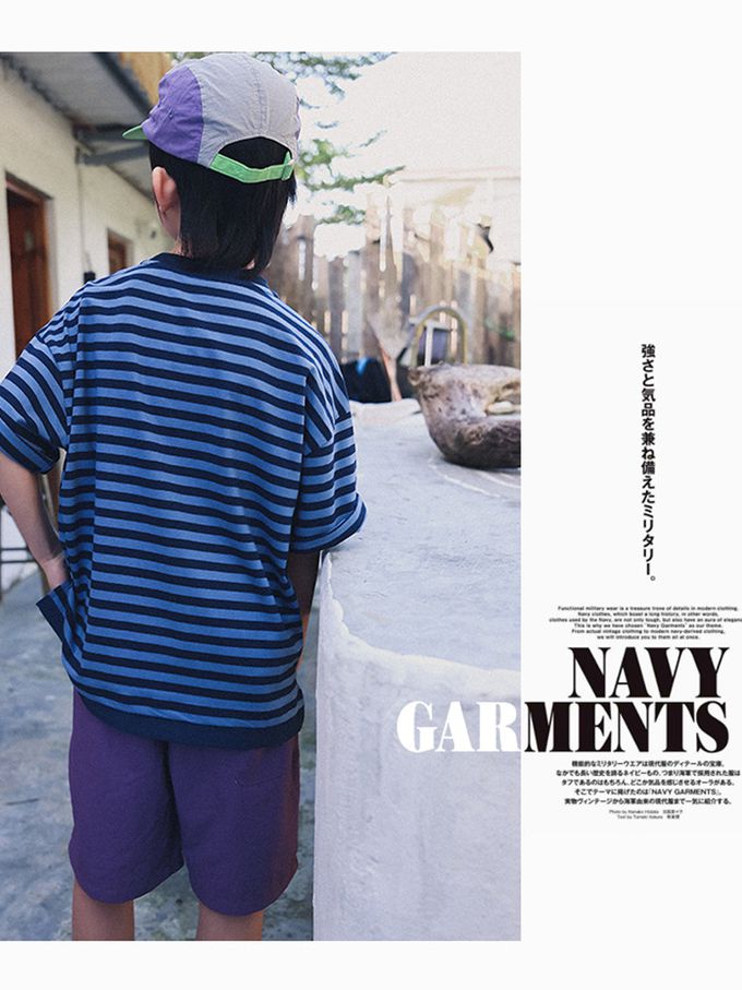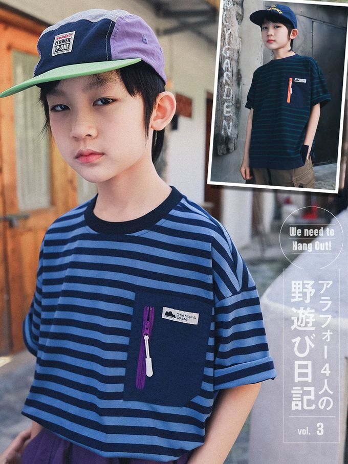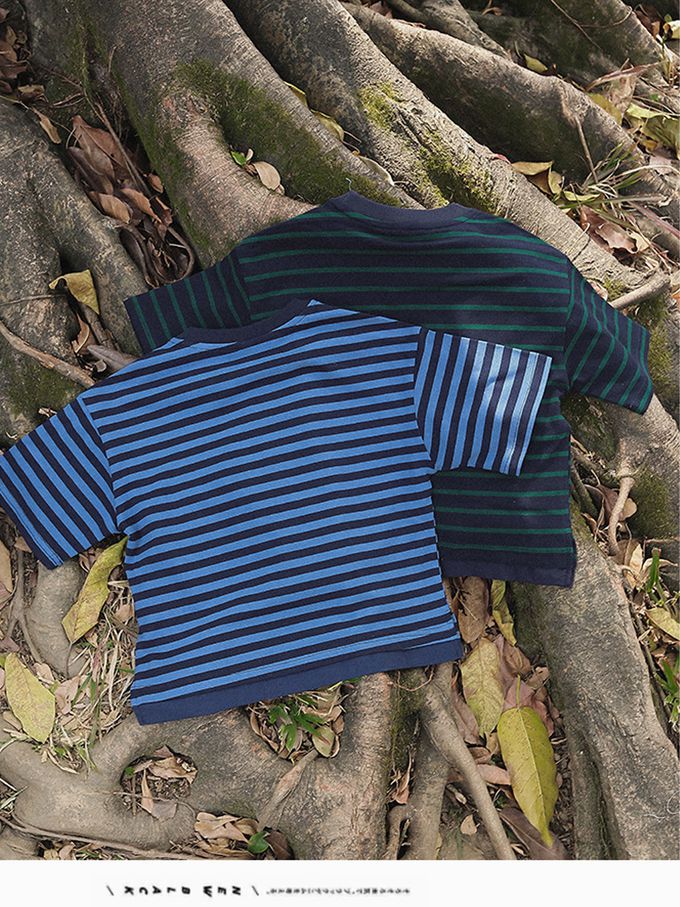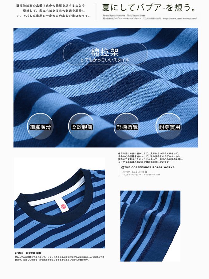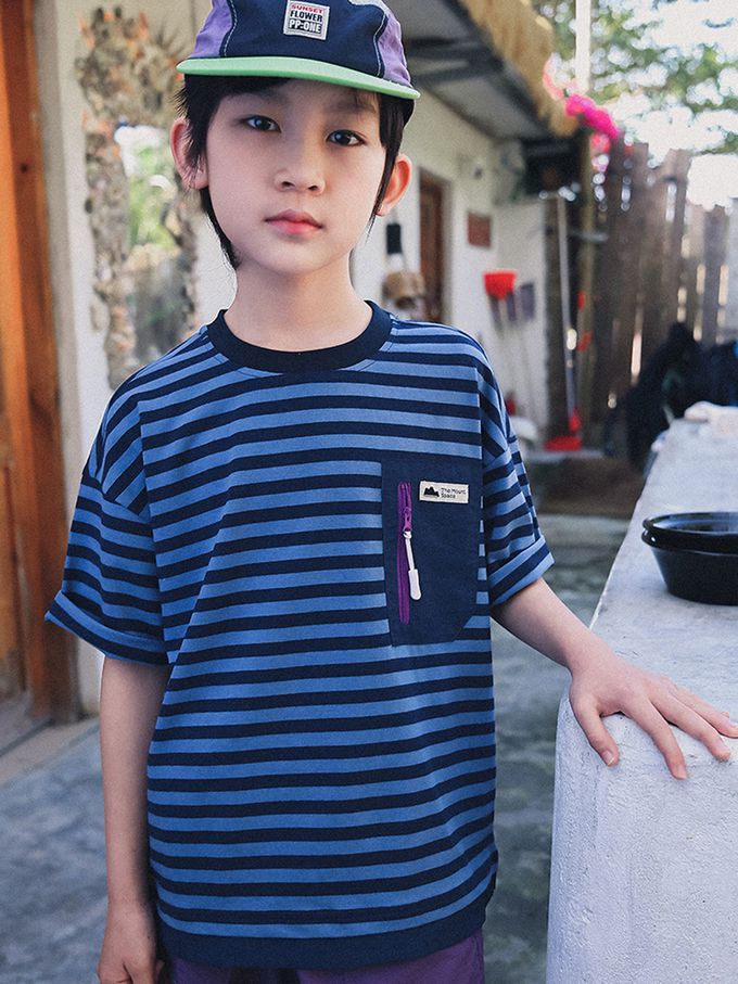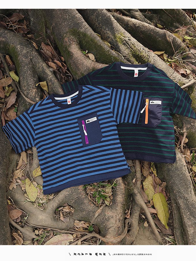 棉質圓領短袖上衣-口袋拉鏈-藍色條紋