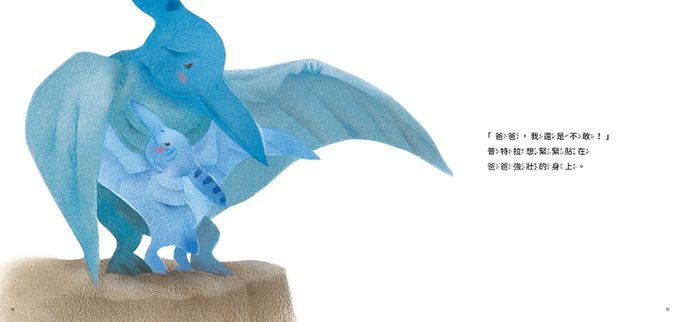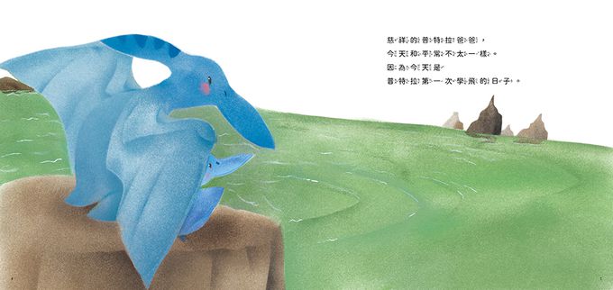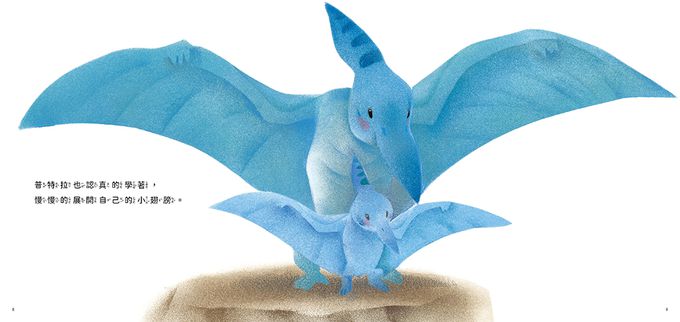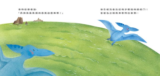 普特拉站在高聳的岩石山頂上學飛,探頭往下看到山谷後,因為緊張而退縮不前。不過,看到爸爸等待風起、乘風而飛的英姿,讓小翼龍獲得勇氣,克服了內心恐懼,奮力展翅,成功飛向天空。透過故事,孩子具體了解到情緒的轉換,從克服恐懼,到獲得勇氣,終得成功的欣喜情緒!