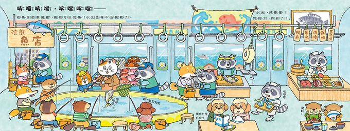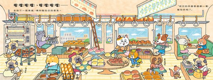 這一節車廂是香噴噴的麵包店,走進下一節車廂,是有好多故事書的書店,