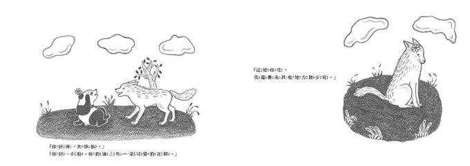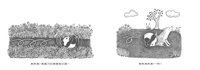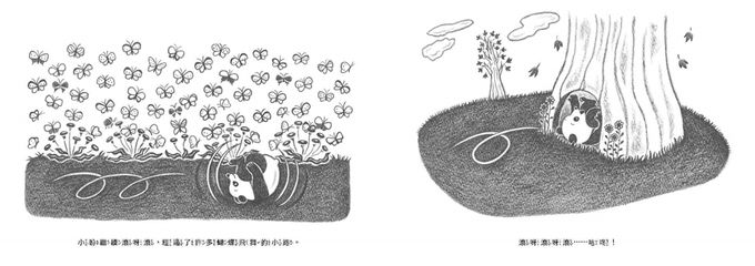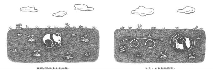全書僅封面有強烈的紅黑白對比色,內頁則單純以黑色色鉛筆繪製而成,這是最吸引嬰幼兒的三種顏色。透過黑色的濃淡明暗與層次變化,細膩展現出小動物們每個神情動作,以及栩栩如生的植物與背景。柔和的筆觸,描繪出一幅幅精美溫暖的畫面。