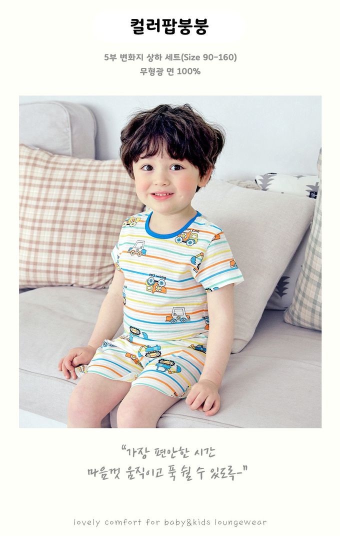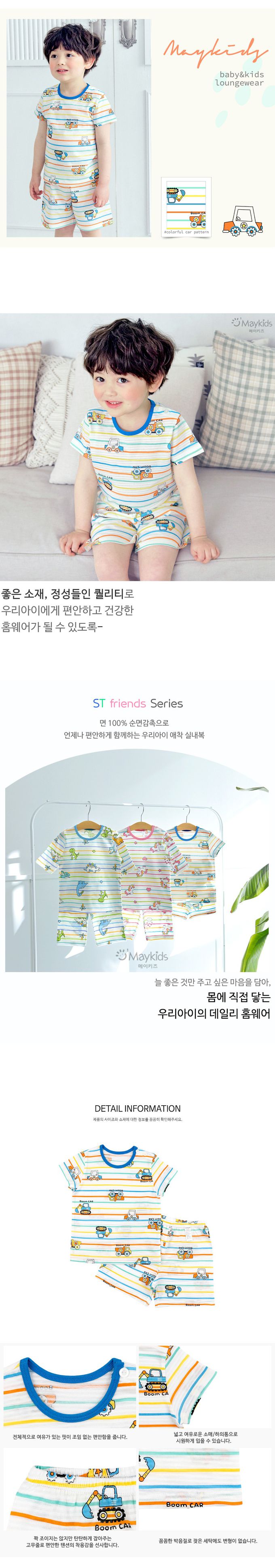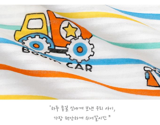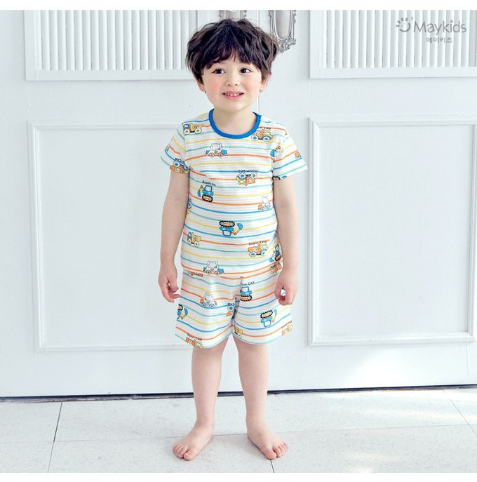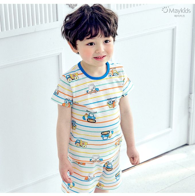 韓國 Maykids - 透氣條紋提花棉短袖家居服-繽紛條紋工程車-白