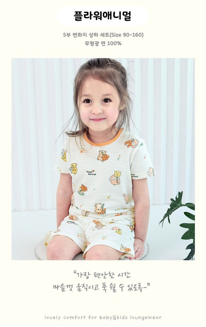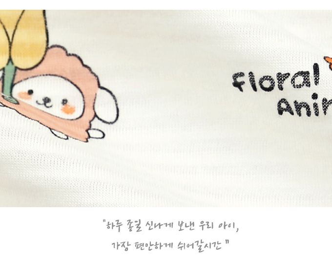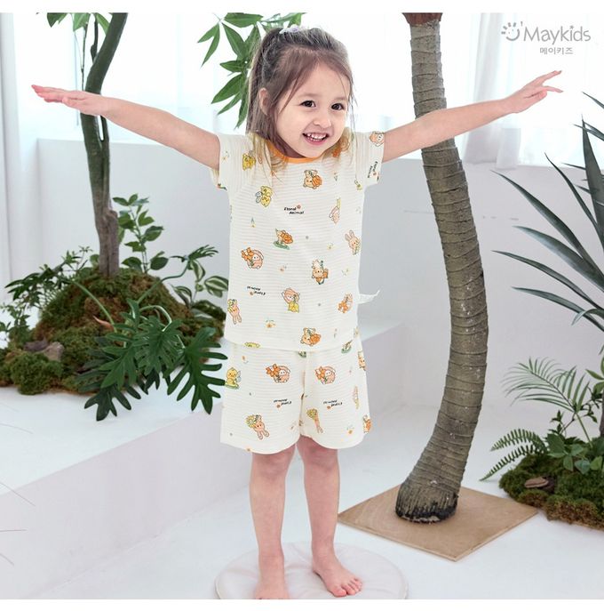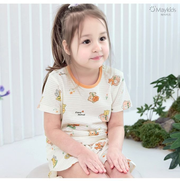 韓國 Maykids - 透氣條紋提花棉短袖家居服-萌趣花朵動物-米黃