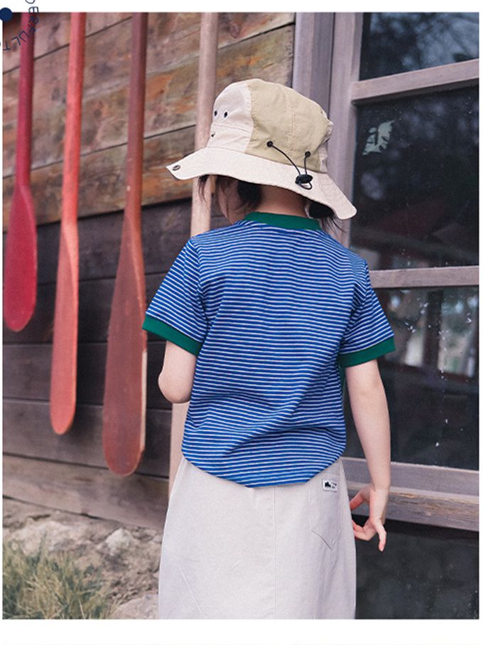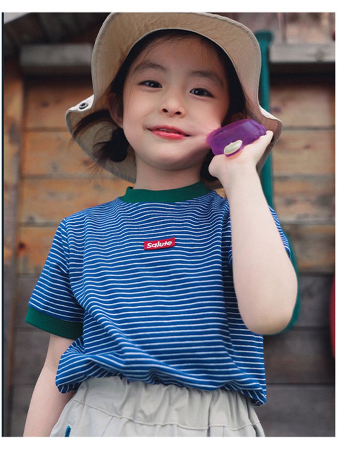 撞色條紋短袖上衣-活力藍