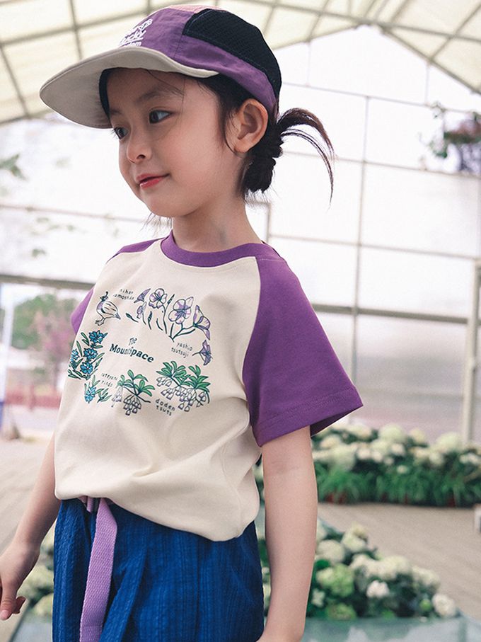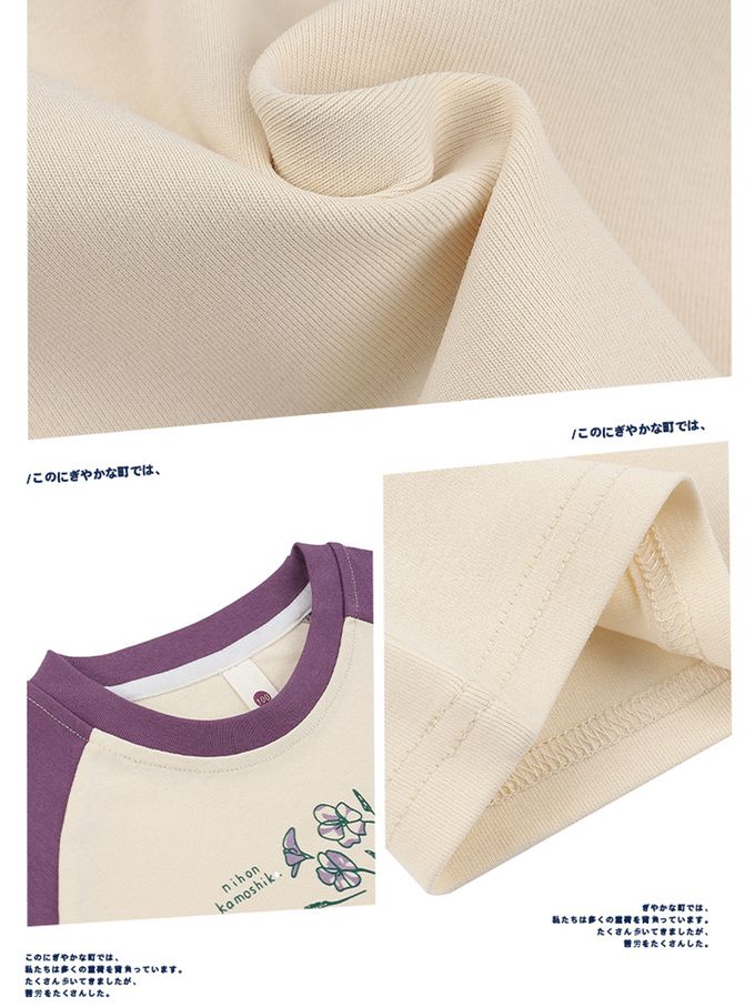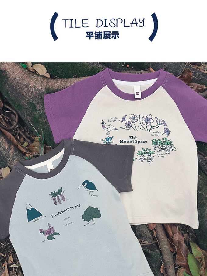棉質圓領短袖上衣-花間小鳥-紫杏
